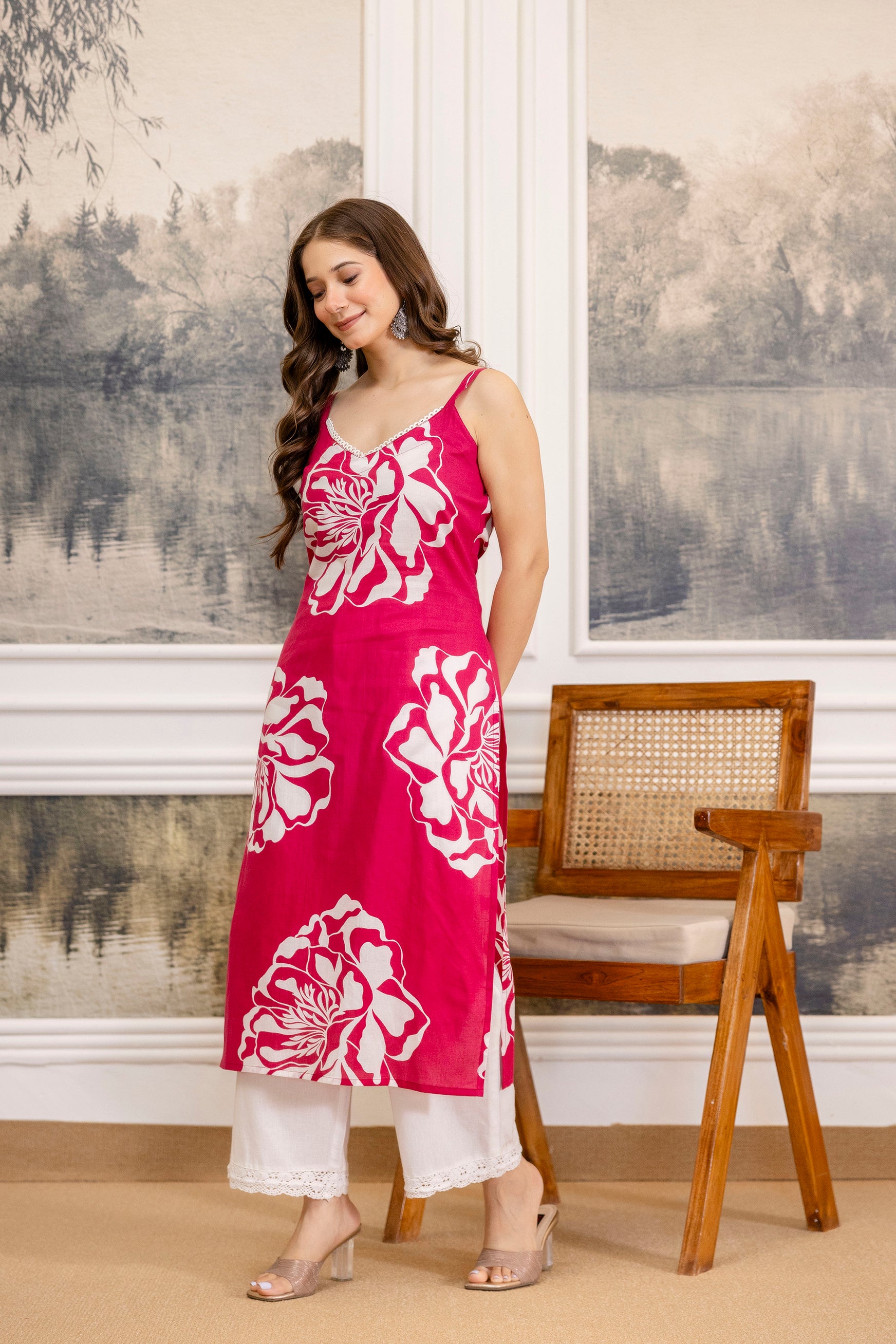 Stay stylish and comfortable with this EthniFlair Sleeveless Floral Kurta. Crafted from soft and breathable Cotton, this kurta is perfect for warm weather and all-day wear. The charming floral print adds a feminine touch, while the sleeveless design keeps it modern and trendy. The lace detailing on the neckline adds a subtle yet elegant finish, making it ideal for casual outings, office wear, or daytime events.