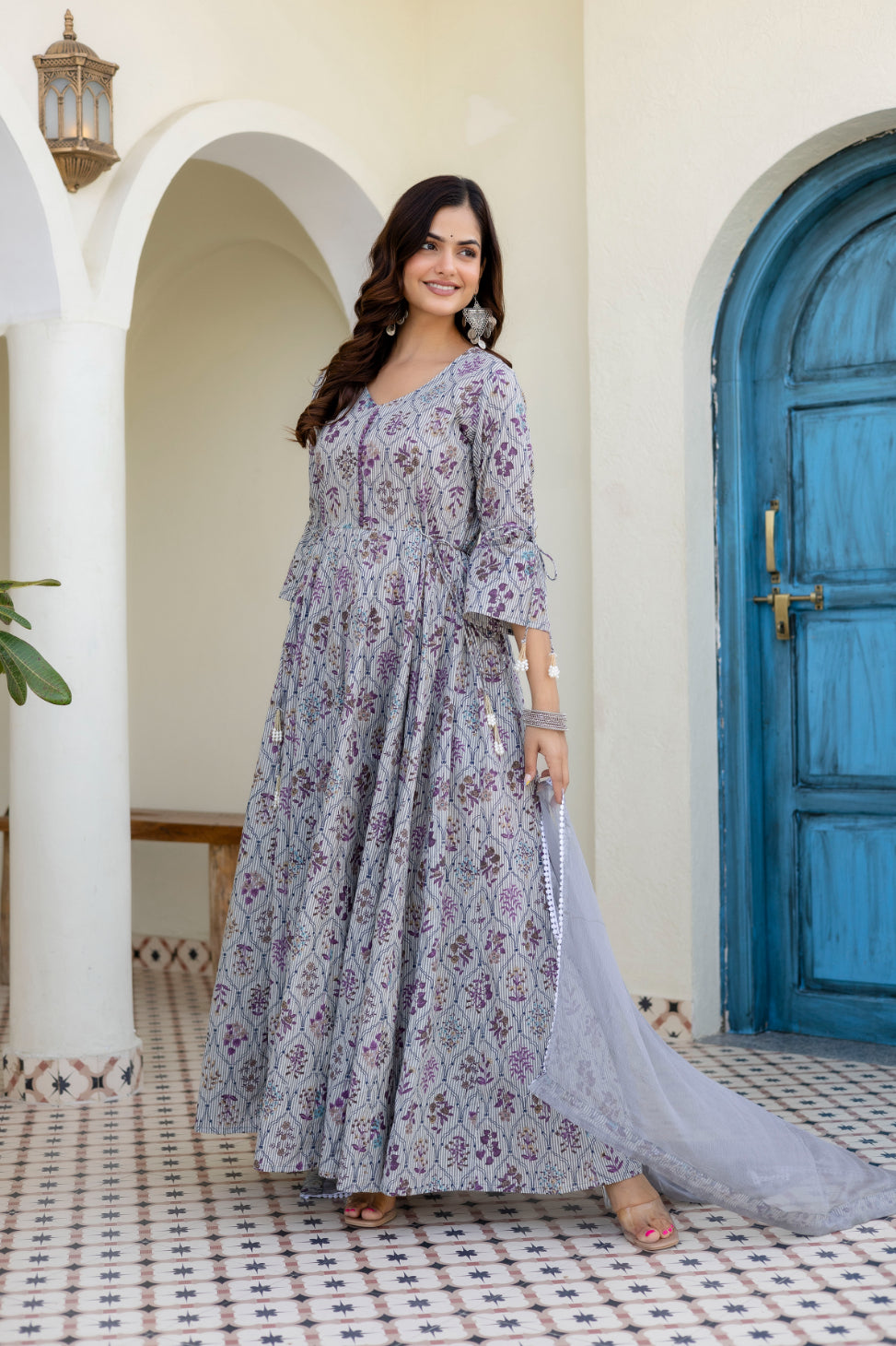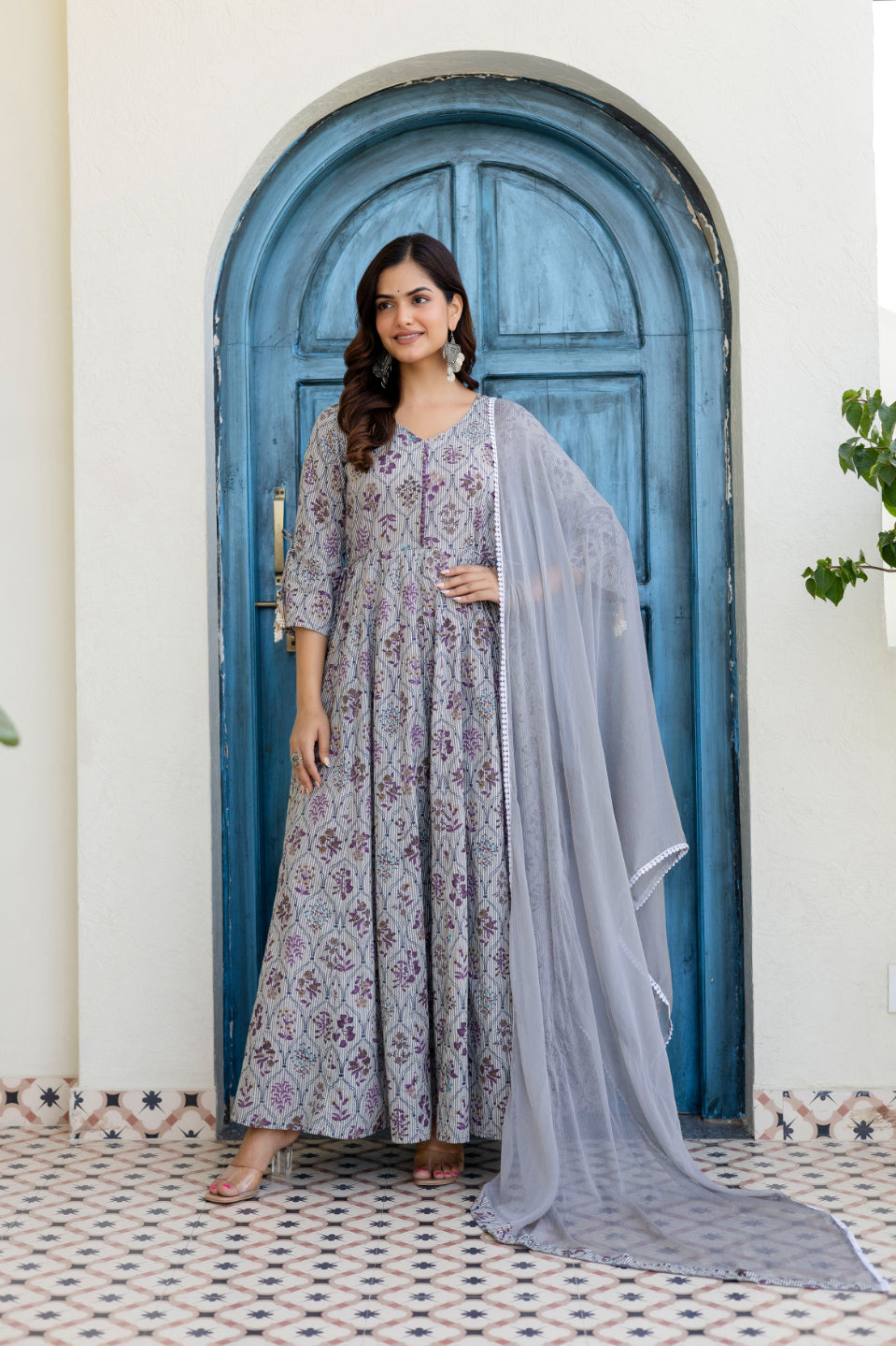 Step into understated elegance with this Grey Cotton Anarkali Kurta with Dupatta, designed for graceful everyday and festive wear. Crafted from soft, breathable cotton, the Anarkali silhouette offers a beautiful flow, while potli button detailing on the yoke adds a classic ethnic touch. Paired with a matching dupatta featuring delicate lace work, this set is perfect for festive gatherings, family functions, and elegant daytime occasions.
