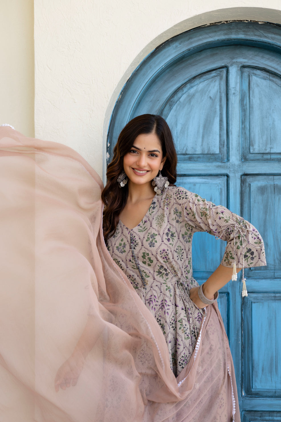 Step into understated elegance with this Beige Cotton Anarkali Kurta with Dupatta, designed for graceful everyday and festive wear. Crafted from soft, breathable cotton, the Anarkali silhouette offers a beautiful flow, while potli button detailing on the yoke adds a classic ethnic touch. Paired with a matching dupatta featuring delicate lace work, this set is perfect for festive gatherings, family functions, and elegant daytime occasions.