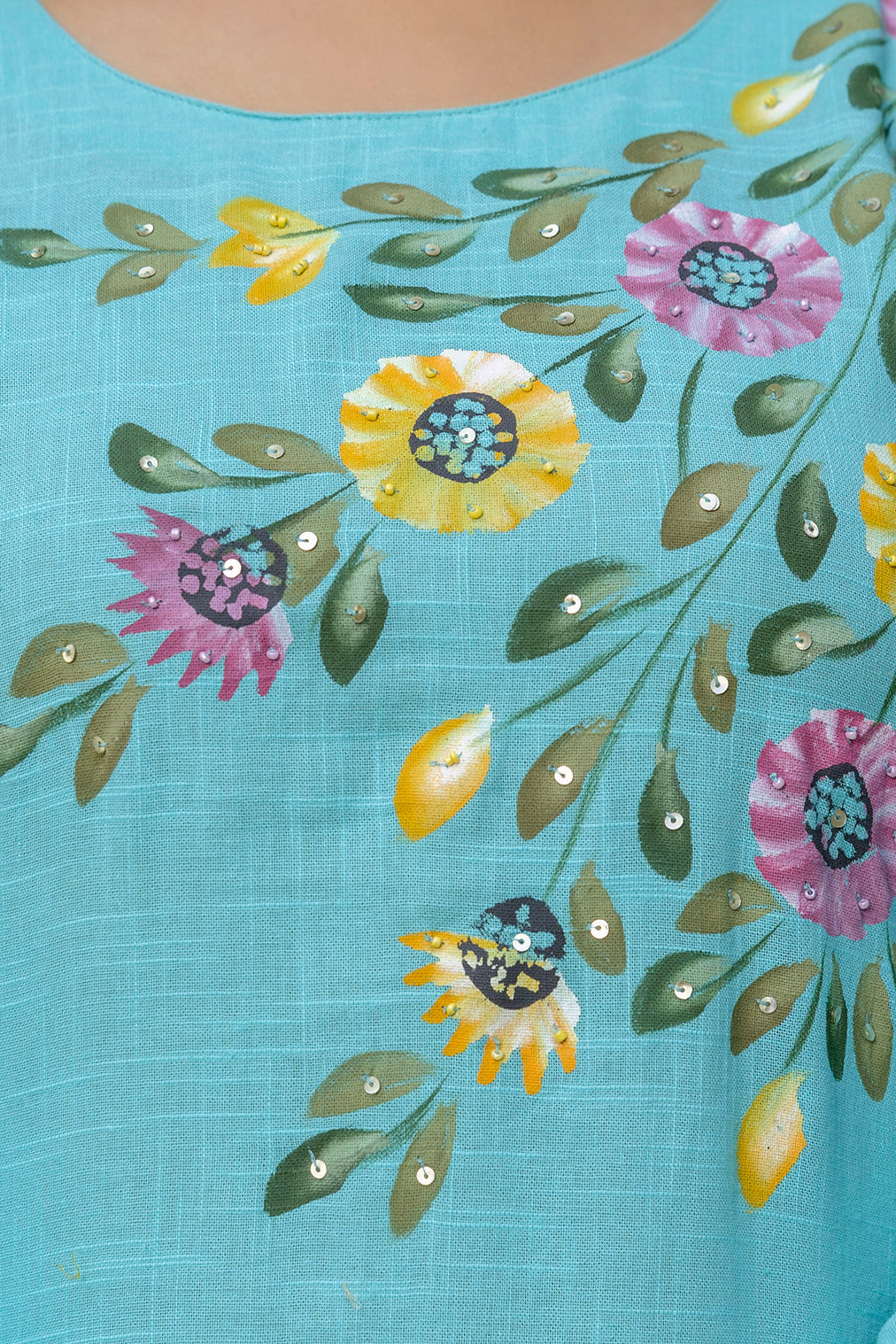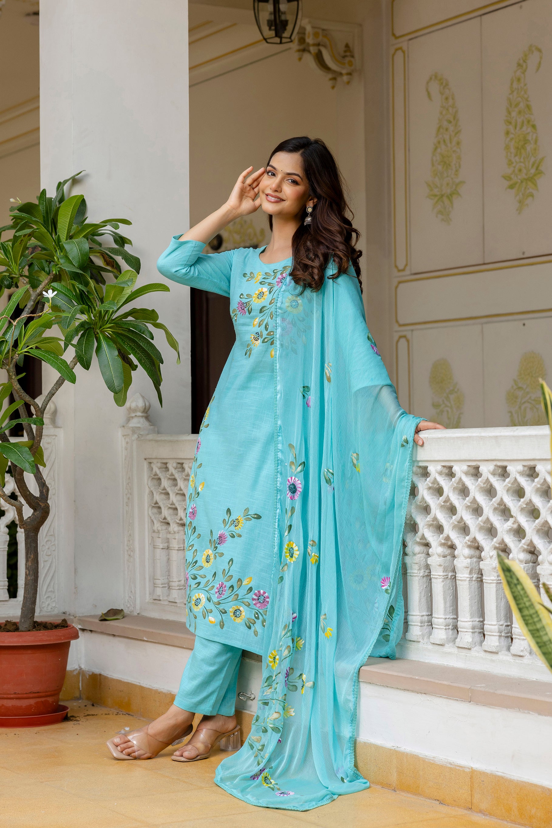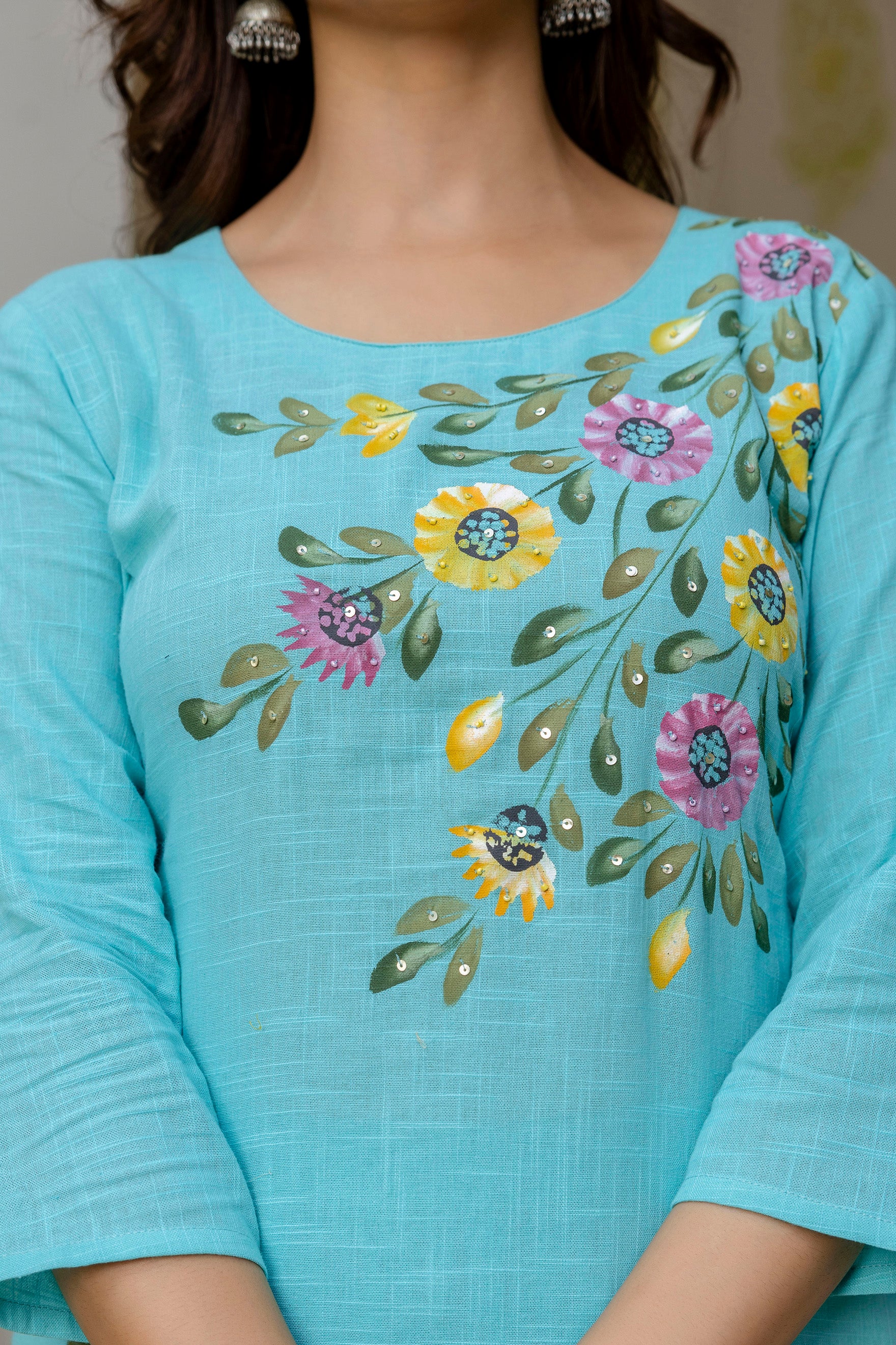 Refresh your ethnic wardrobe with this EthniFlair Floral Printed Kurta Set. Made from soft Cotton Slub, the kurta showcases aari work on the front panel complemented by elegant brush-paint detailing. The set includes comfortable pyjamas and a Nazneen dupatta with brush-paint accents, perfect for festive outings and casual wear.