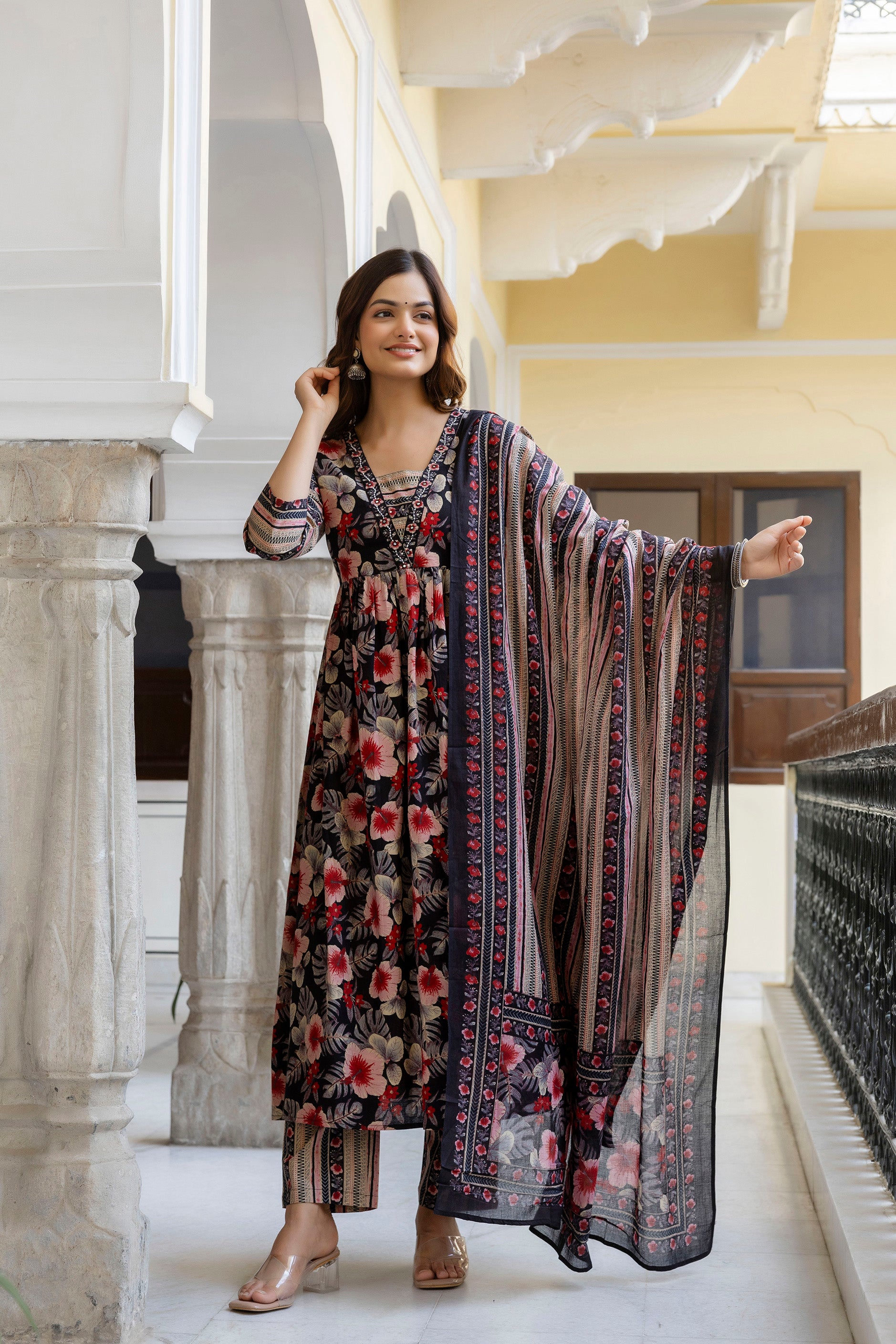 This EthniFlair Black Empire Kurta Set offers a perfect blend of elegance, comfort, and traditional detailing. Made from soft cotton, the empire-style kurta provides a flattering silhouette with a graceful flare. The floral print adds subtle charm, while the delicate hand work on the yoke enhances its artisanal appeal. Paired with matching cotton trousers and a lightweight mulmul dupatta, this set is ideal for festive occasions, family gatherings, and semi-formal events.