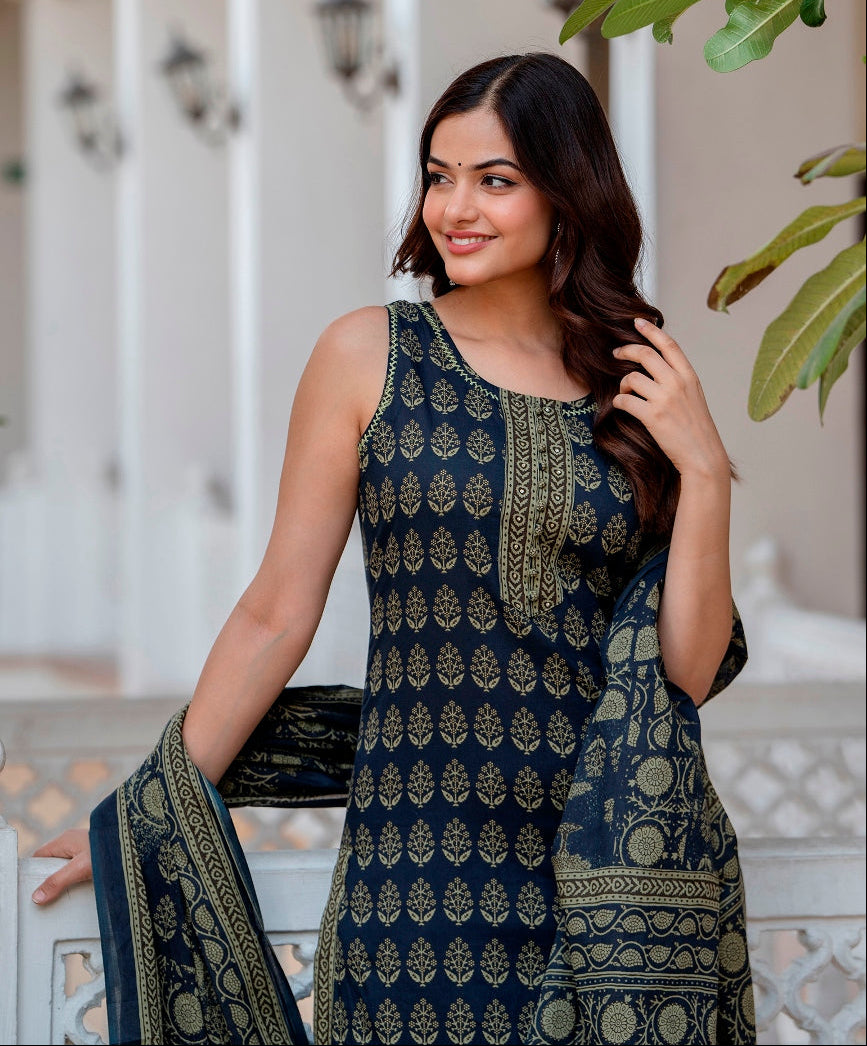 Enhance your ethnic wardrobe with this EthniFlair Floral Printed Kurta with Pyjamas & Dupatta. Designed with delicate handwork on the yoke, this ensemble beautifully combines traditional artistry with a modern floral print. The soft and breathable fabric ensures comfort throughout the day, while the coordinated pyjamas and dupatta complete the elegant festive look — perfect for celebrations, family gatherings, or casual ethnic outings.