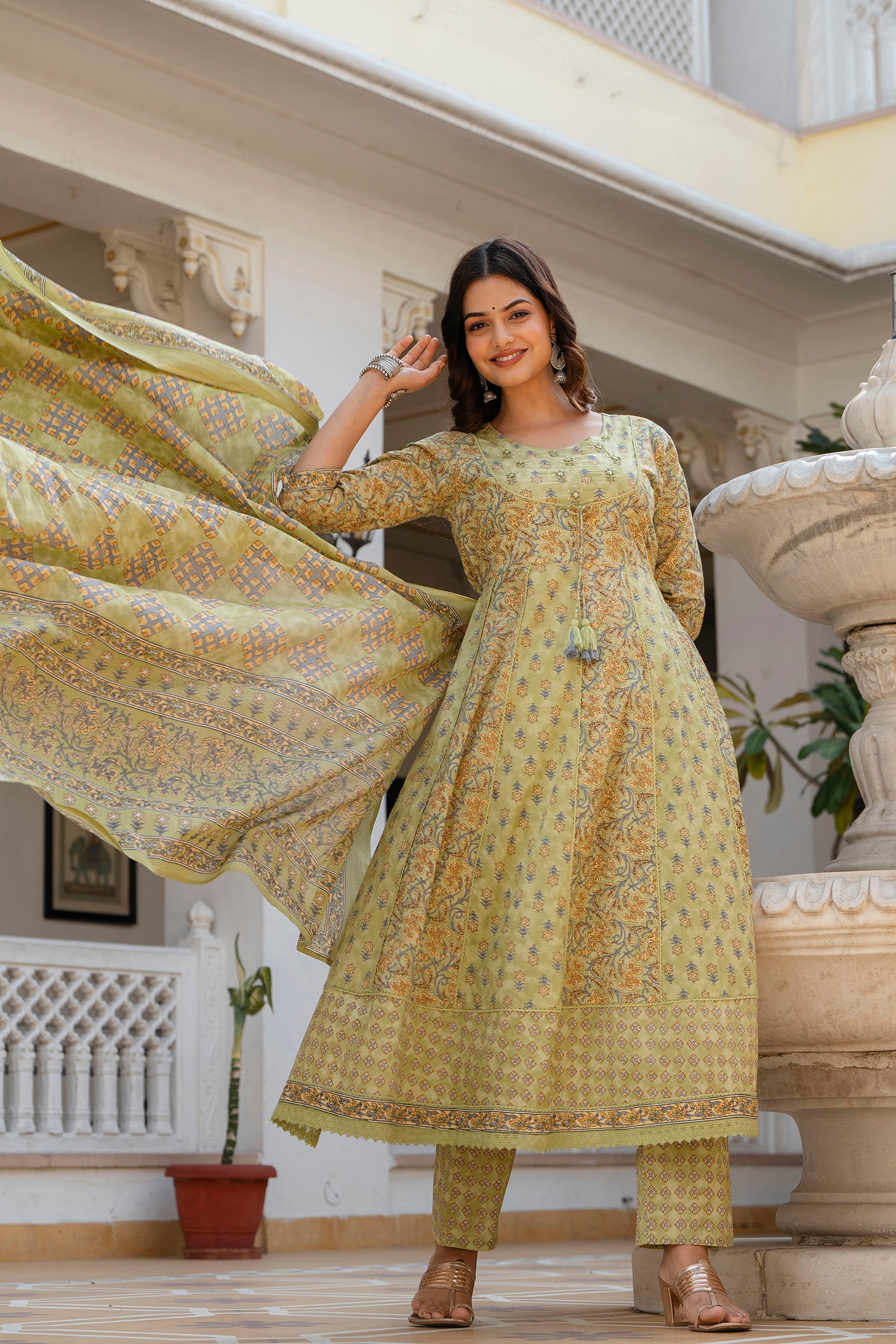 Grace your festive and casual wardrobe with this elegant EthniFlair Floral Printed Panelled Kurta Set. Crafted with exquisite Aari handwork on the yoke, this outfit showcases traditional artistry blended with modern style. The cotton lace detailing adds a soft, feminine charm, while the tassels on the dupatta enhance its ethnic appeal. Perfect for festive gatherings, family events, or casual celebrations.