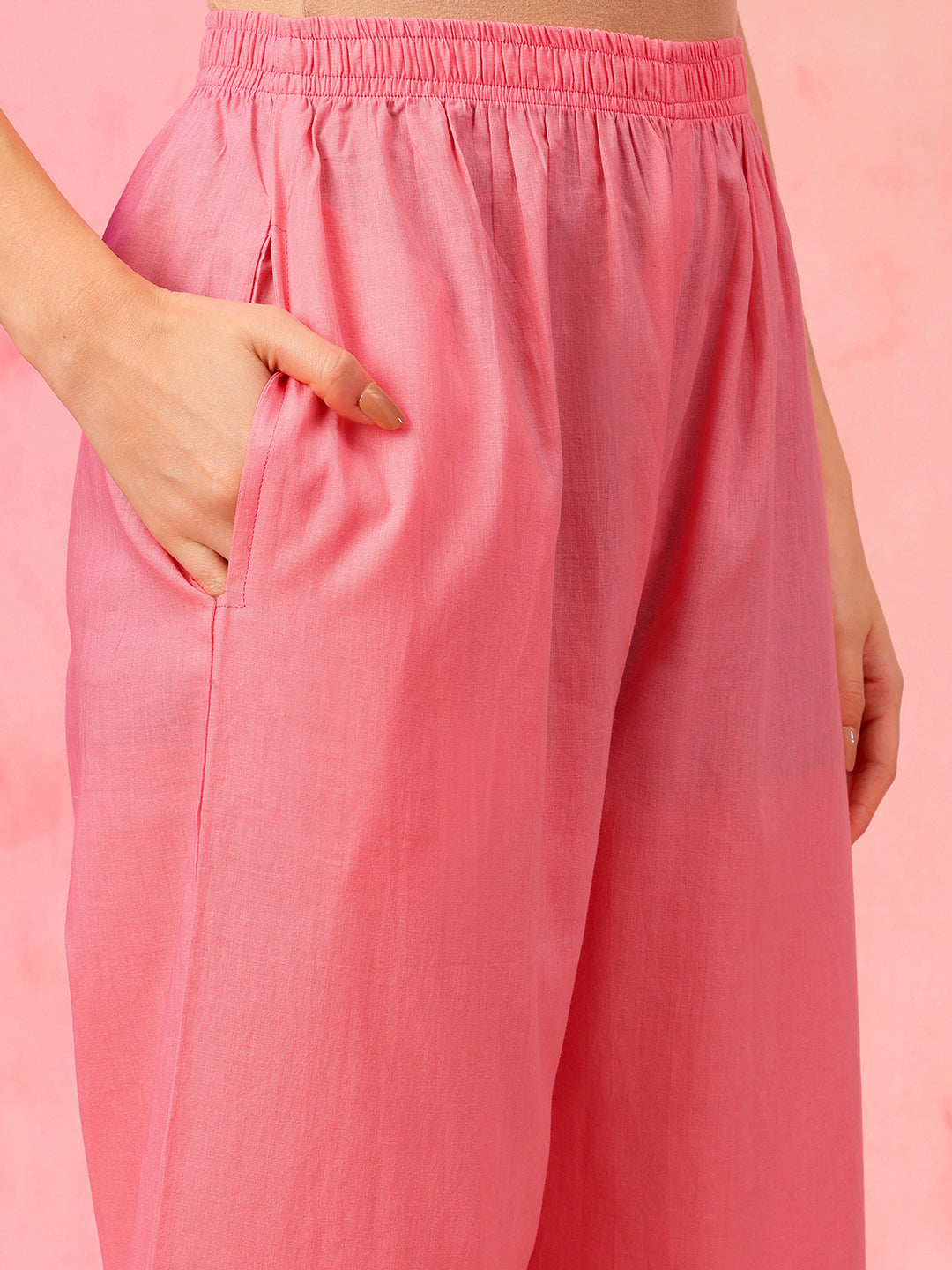This EthniFlair Pink Floral Printed A-Line Kurta Set offers a perfect blend of elegance and comfort. Crafted from premium cotton, the A-line silhouette drapes beautifully, giving a flattering and flowy look. The V-neckline adds a touch of sophistication, while the intricate hand work on the yoke enhances its traditional charm. The set includes matching cotton trousers for a complete and polished outfit. Finished with a Nazneen dupatta adorned with delicate lace, this ensemble is ideal for festive gatherings, celebrations, office functions, and special occasions.