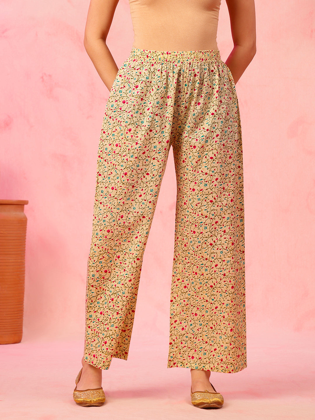 This EthniFlair Cream Floral Printed A-Line Kurta Set blends soft elegance with everyday comfort. Tailored in breathable cotton, the A-line silhouette offers a graceful fall and a flattering fit. The V-neckline adds a refined look, while the all-over floral print enhances its charm. Paired with comfortable cotton trousers and a lightweight mulmul dupatta featuring delicate lace detailing, this set is perfect for festive functions, family gatherings, office wear, and special occasions.
