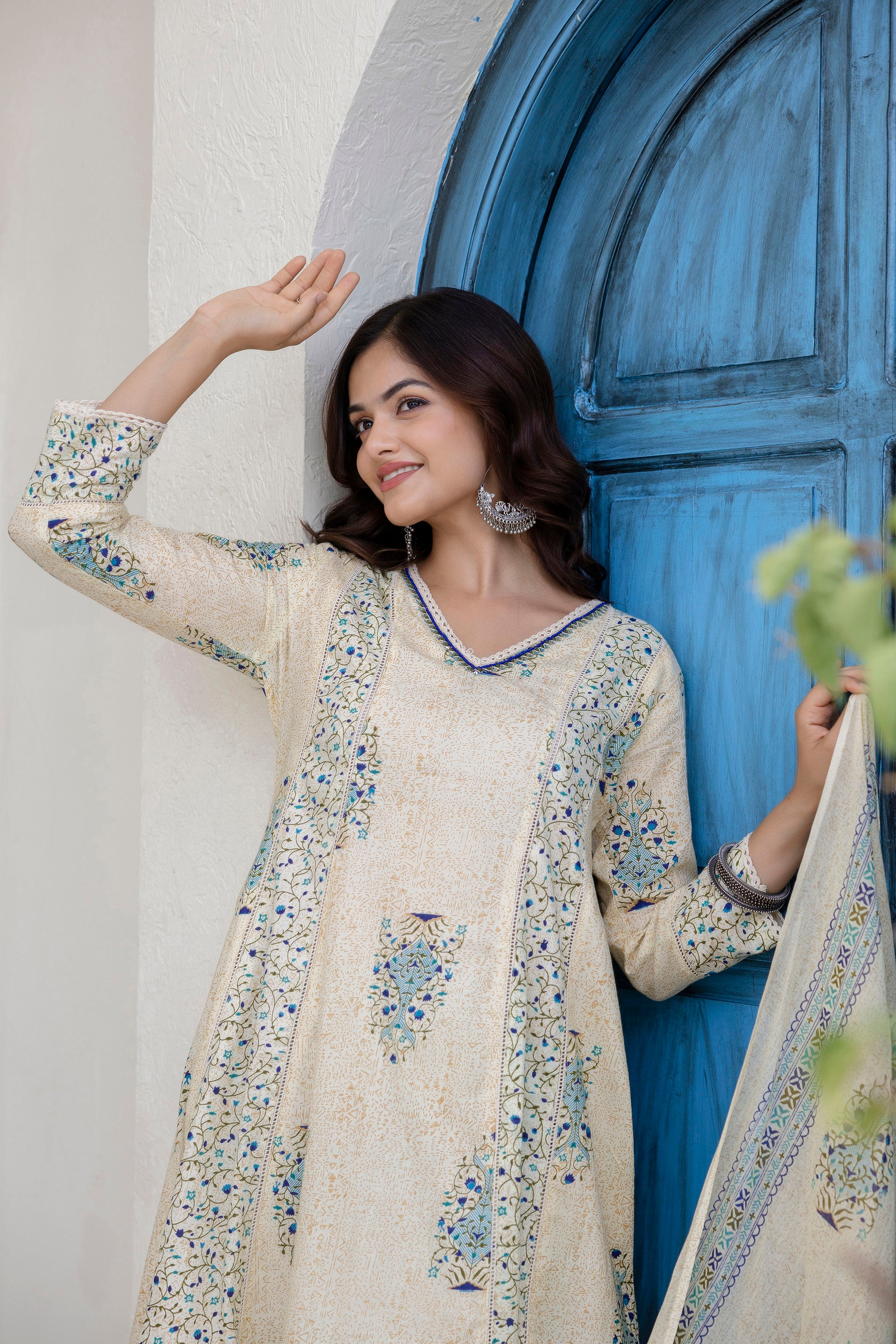 This EthniFlair Blue Floral Printed A-Line Kurta Set brings together elegance, comfort, and everyday versatility. Crafted from soft cotton, the A-line kurta offers a flattering and flowy silhouette, paired with a stylish V-neckline for a refined look. The floral print adds a refreshing touch, making it suitable for both casual and semi-formal occasions. The set includes matching cotton trousers for all-day comfort and a lightweight mulmul dupatta enhanced with delicate lace detailing. Perfect for festive events, office functions, and family gatherings.