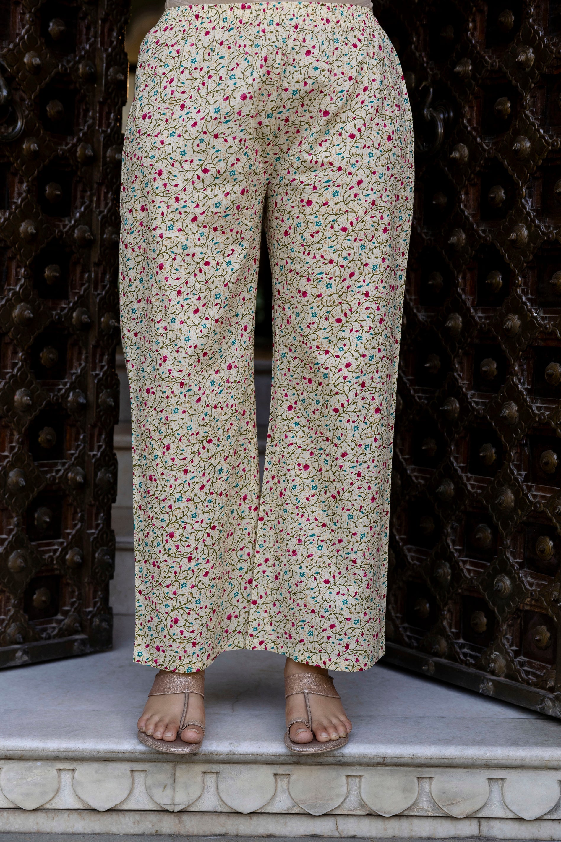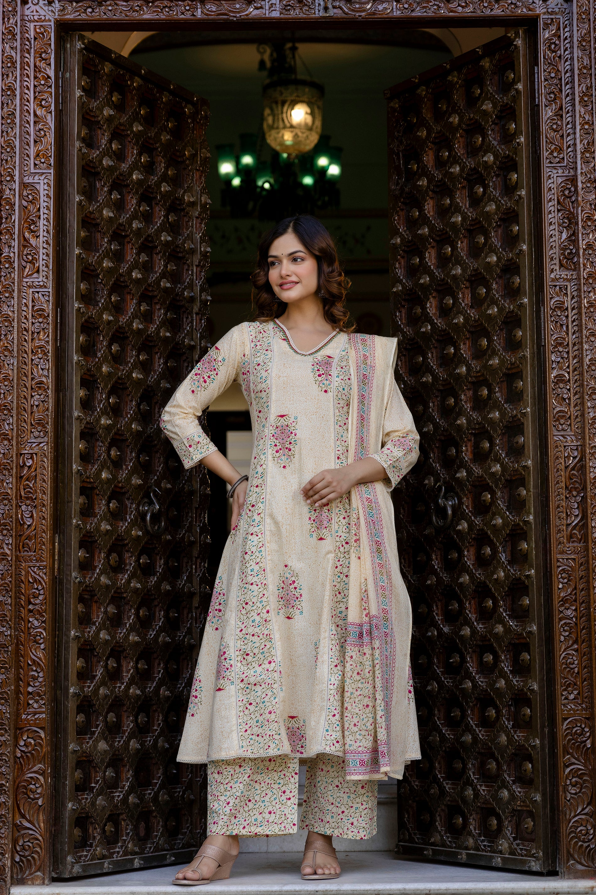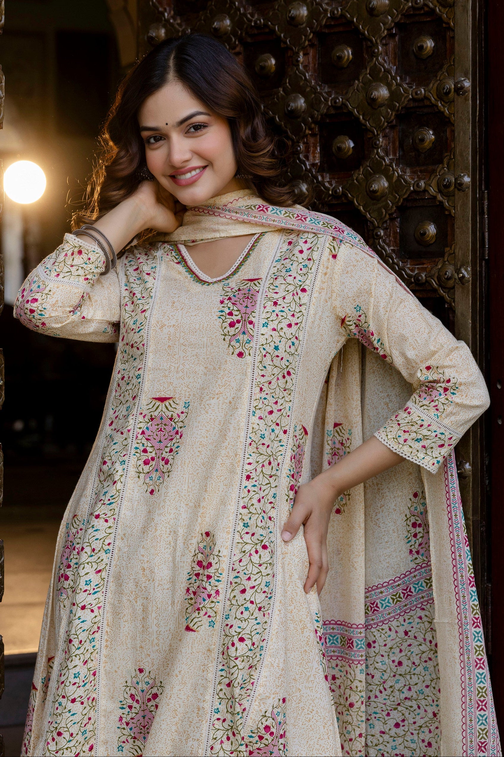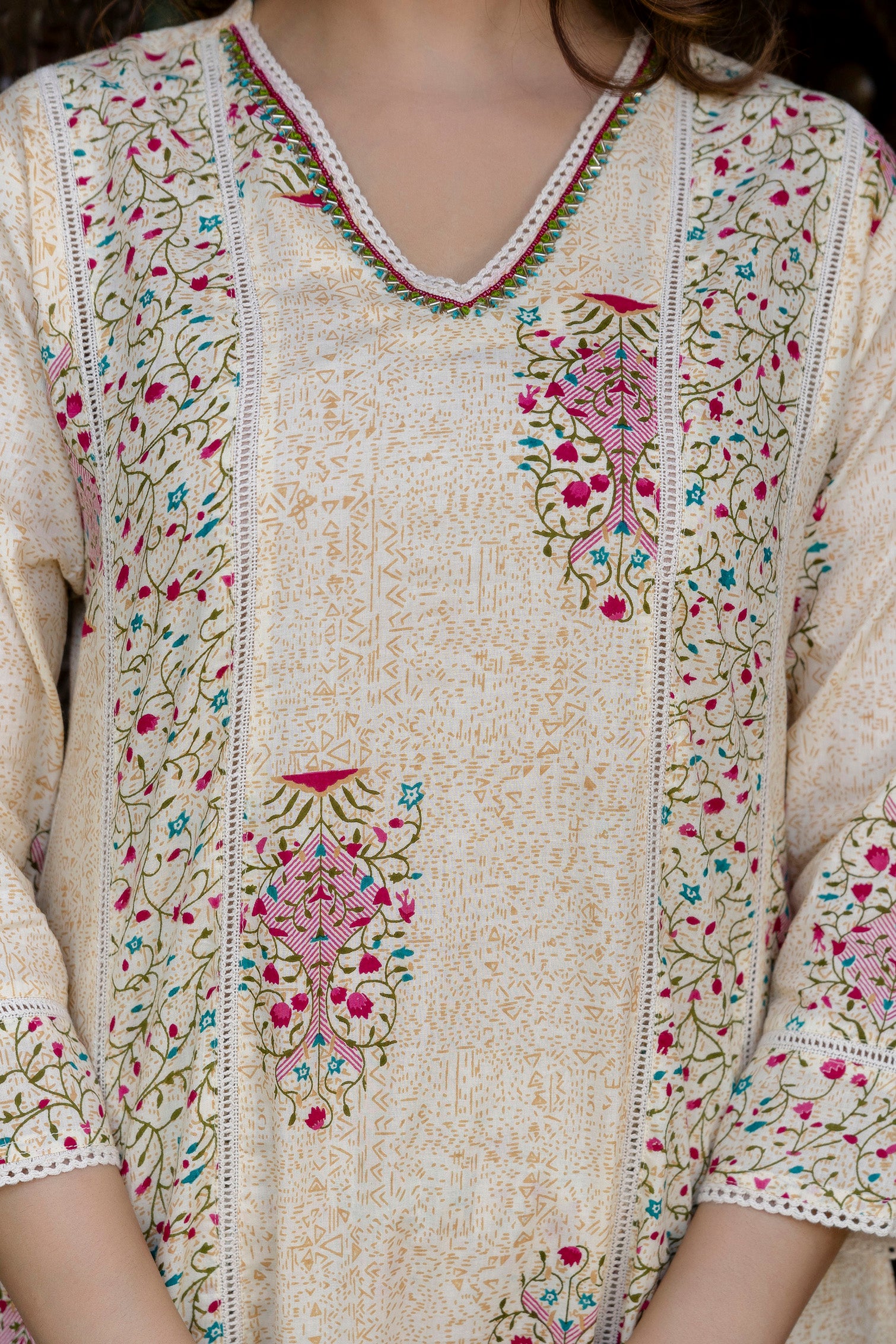 This EthniFlair Cream Floral Printed A-Line Kurta Set is designed for effortless elegance and all-day comfort. Made from breathable cotton, the A-line kurta offers a graceful fall and a flattering shape. The V-neckline adds a sophisticated touch, while the floral print enhances its refreshing and timeless appeal. The set comes with matching cotton trousers and a lightweight mulmul dupatta adorned with delicate lace detailing. Perfect for festive events, family functions, office wear, and semi-formal occasions.