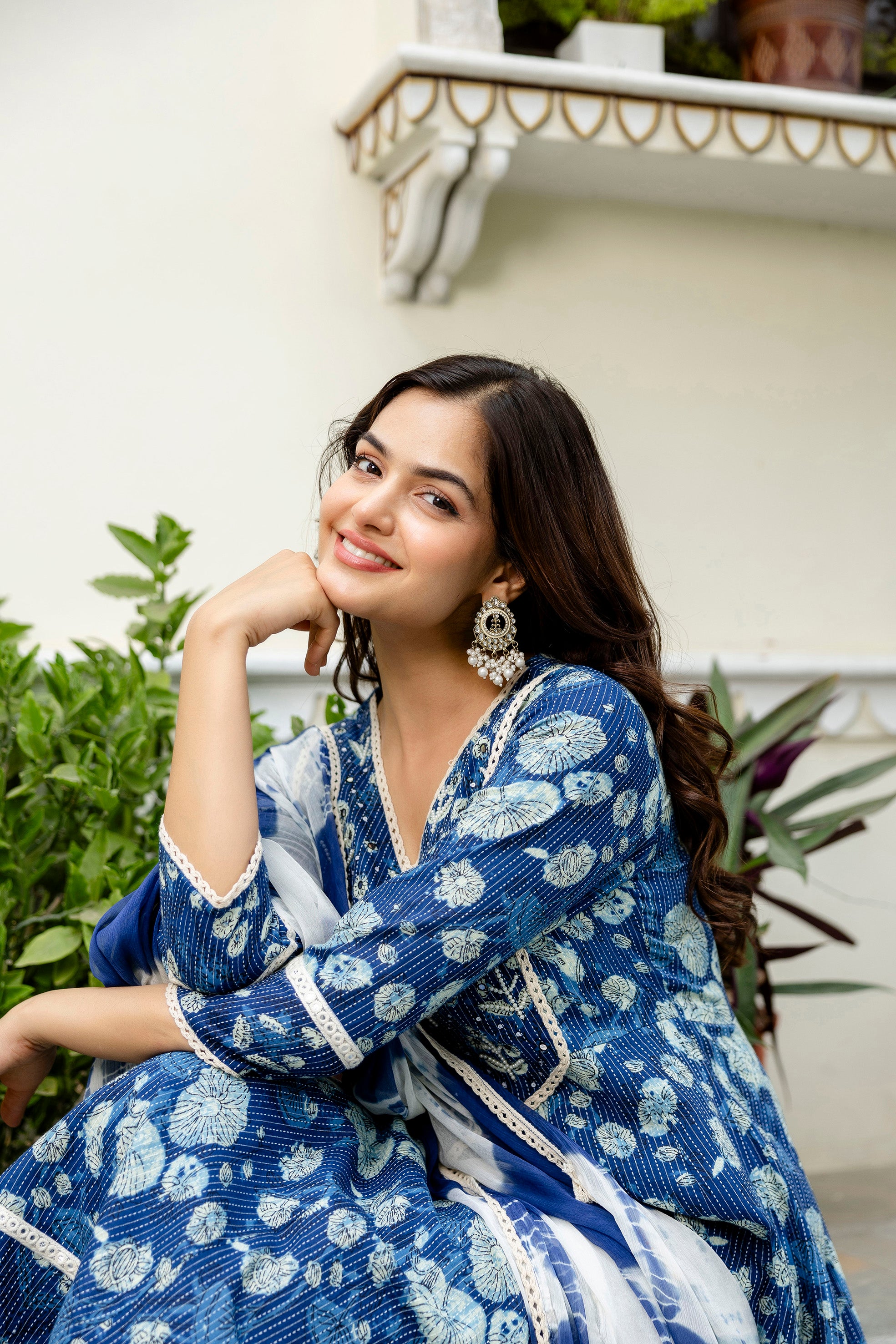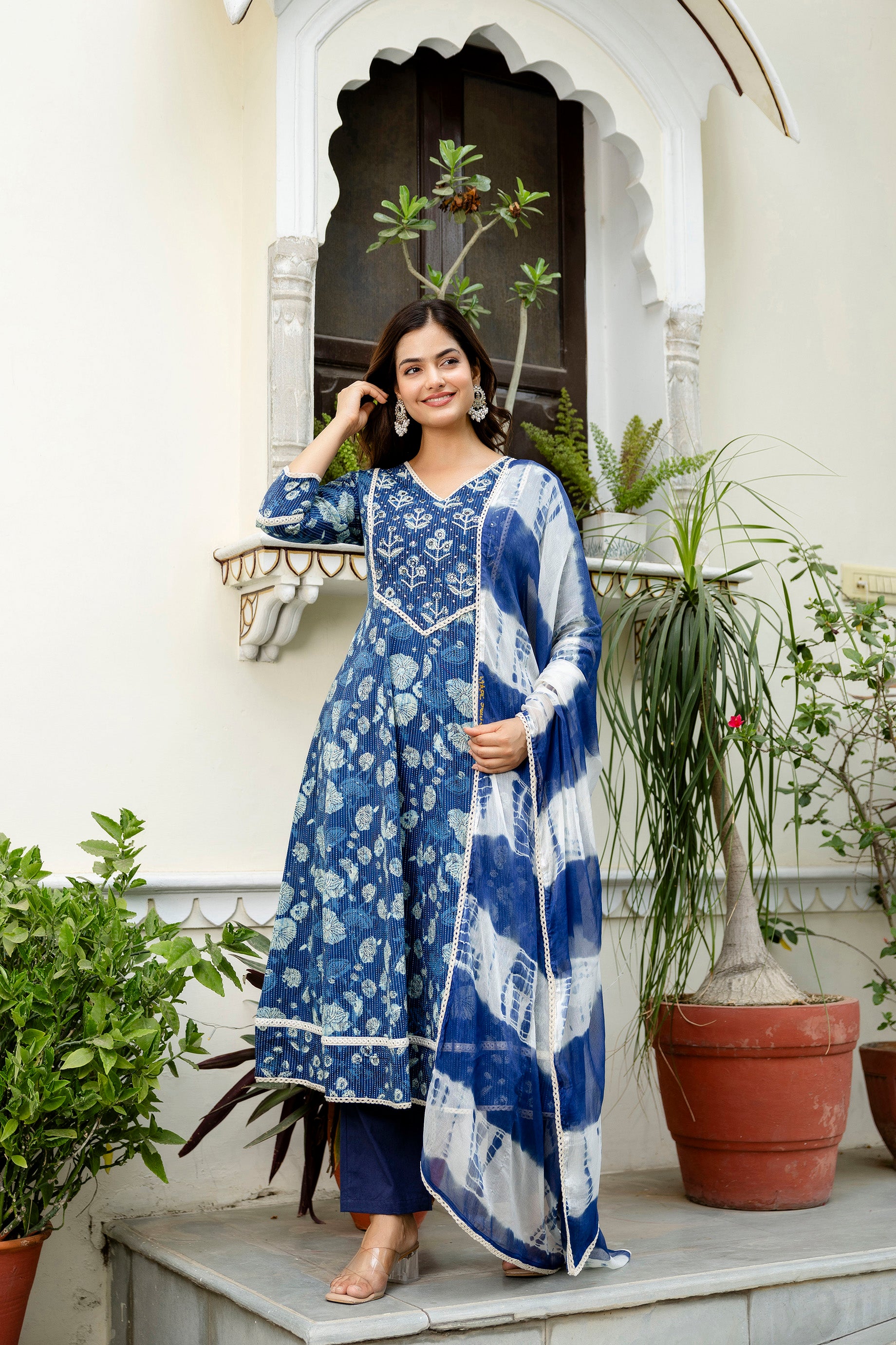 Style: V-neck floral printed Anarkali kurta with pyjamas & dupatta