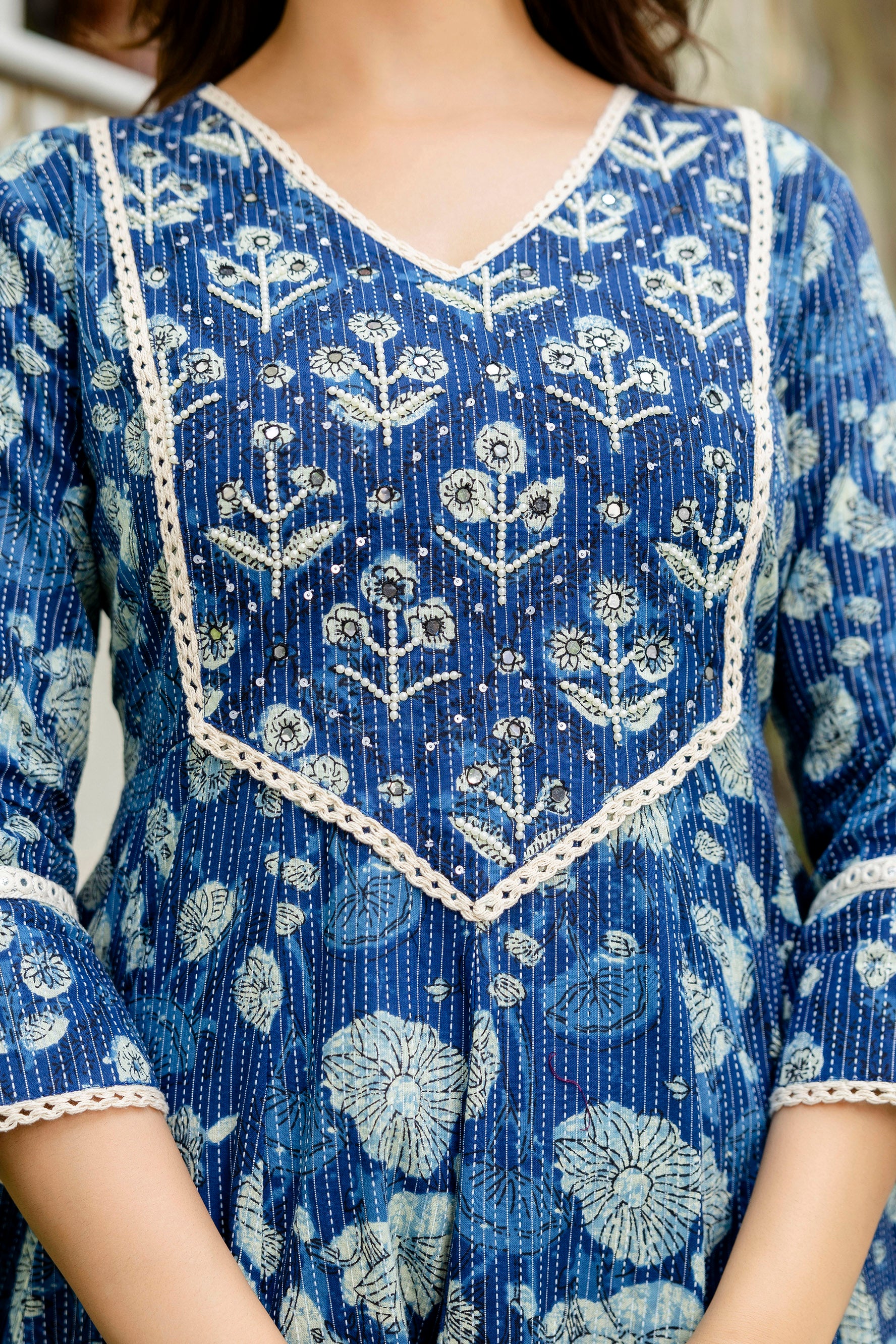 Bring elegance to your festive wardrobe with this EthniFlair Floral Printed V-Neck Anarkali Kurta Set. Crafted in soft Cotton, it features hand work on the yoke and detailed katha work on the fabric. The set includes comfortable pyjamas and a Nazneen dupatta with lace detailing, making it perfect for celebrations and special occasions.