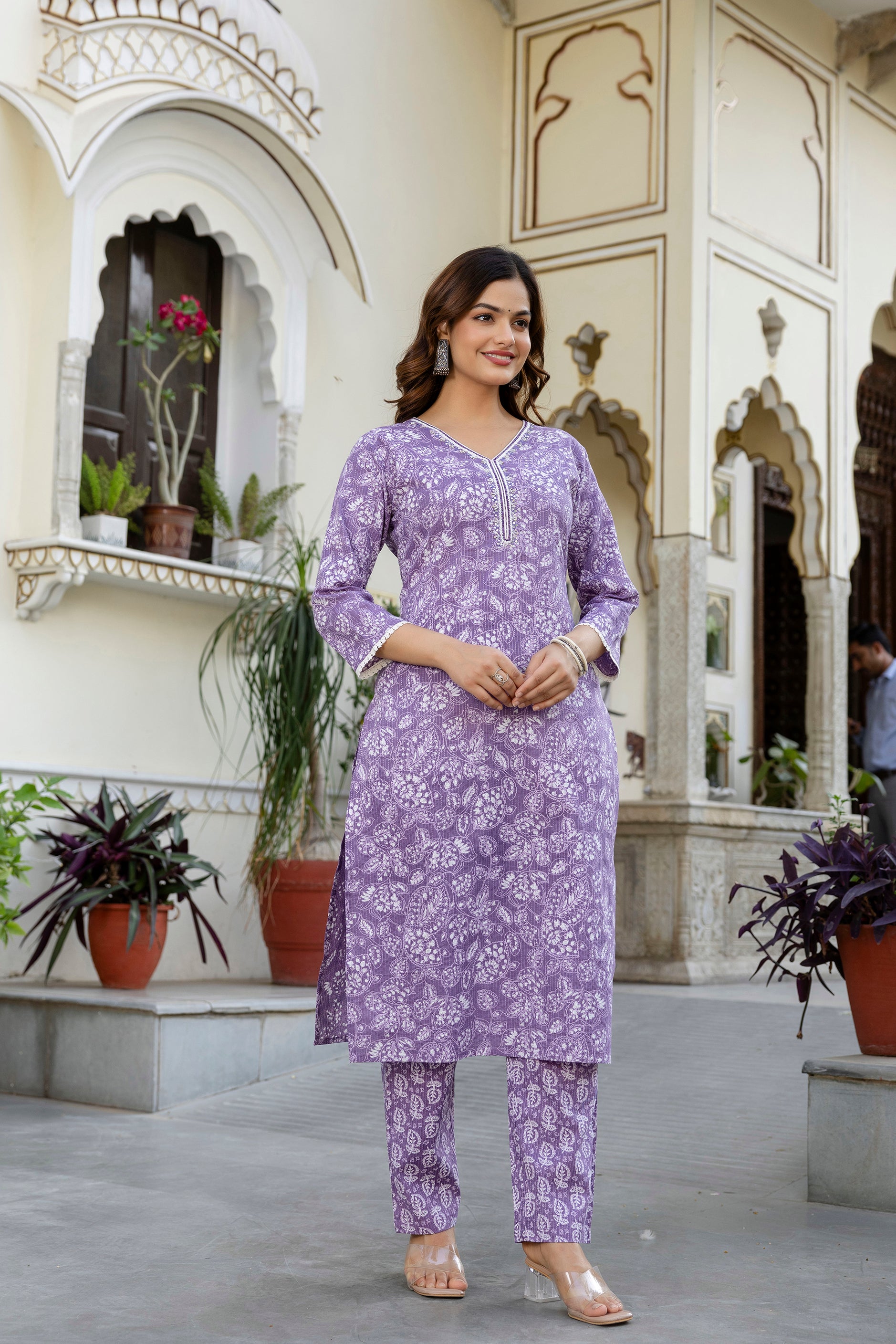 This EthniFlair Purple Kurta Set combines traditional elegance with comfortable wear. Crafted from soft cotton, the kurta features a floral yoke design with intricate Aari embroidery, complemented by delicate lace, hand work, and subtle Katha work on the fabric. Paired with matching cotton pyjamas and a lightweight Nazneen dupatta, this set is perfect for festive occasions, family gatherings, and semi-formal events, offering both style and ease of wear.