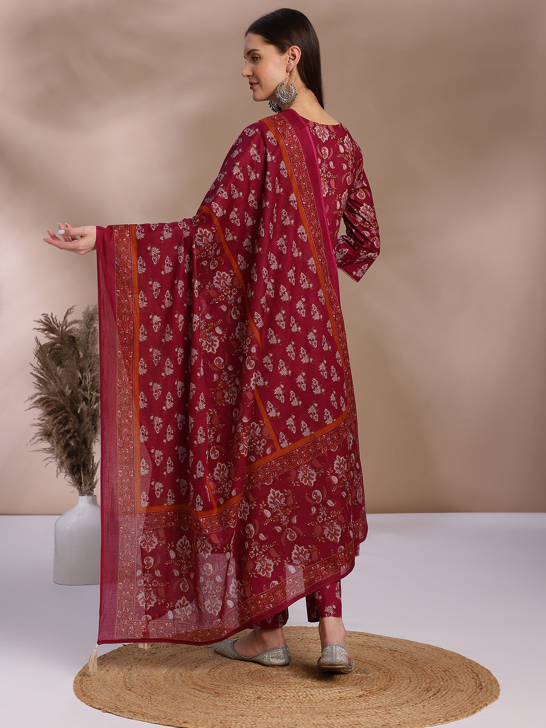 Add a vibrant festive charm to your ethnic wardrobe with this EthniFlair Floral Yoke Design Angrakha Aari Work Kurta with Trousers & Dupatta. Crafted from breathable cotton, the magenta Angrakha-style kurta features detailed hand work on the yoke along with traditional Aari embroidery. The signature Angrakha tie-ups with tassels enhance its graceful and elegant look. Paired with matching cotton trousers and a lightweight mulmul dupatta adorned with delicate tassels, this set offers a complete traditional outfit perfect for festive celebrations, cultural events, and family gatherings.