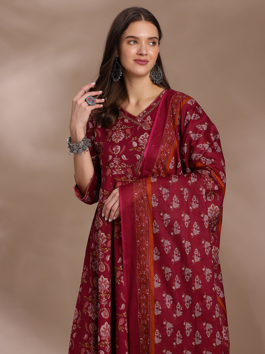 EthniFlair Floral Yoke Design Angrakha Aari Work Kurta with Trousers & Dupatta