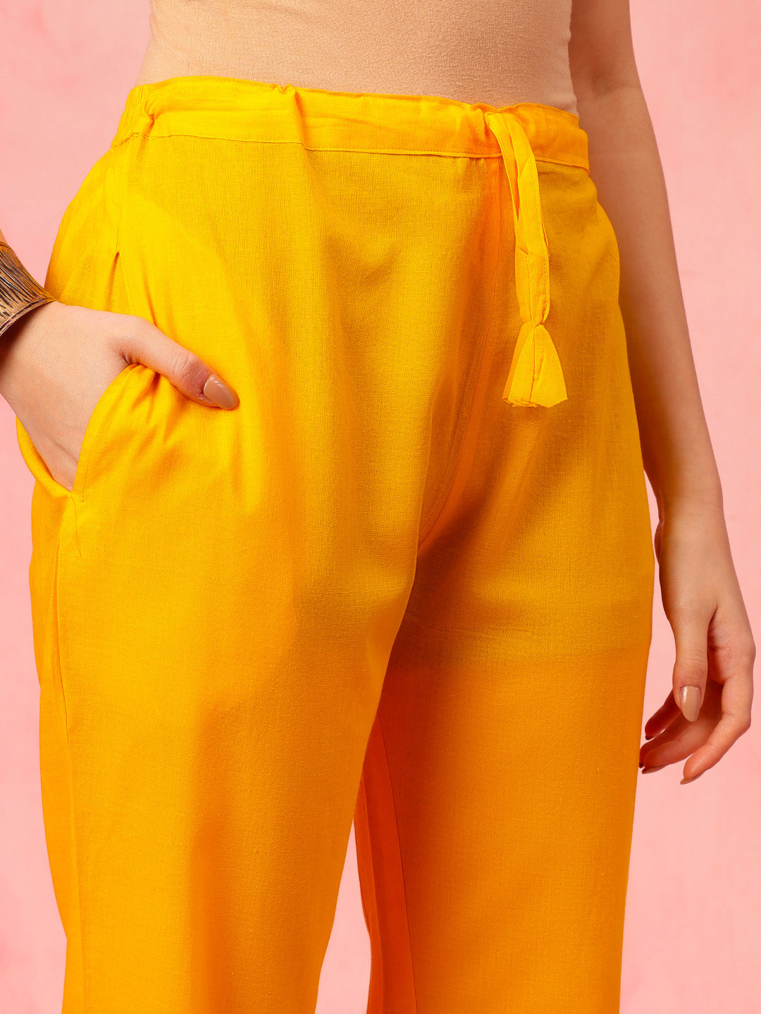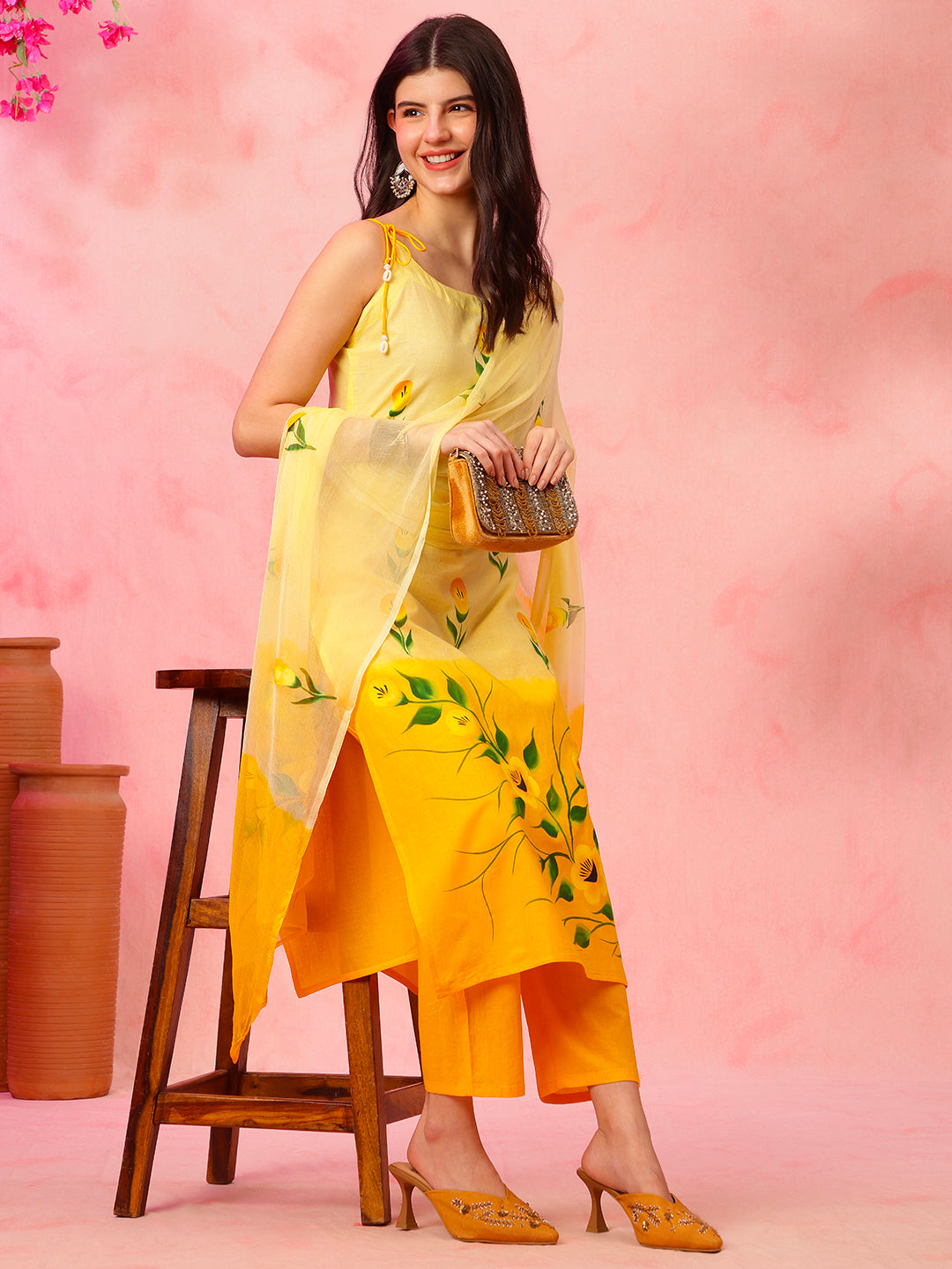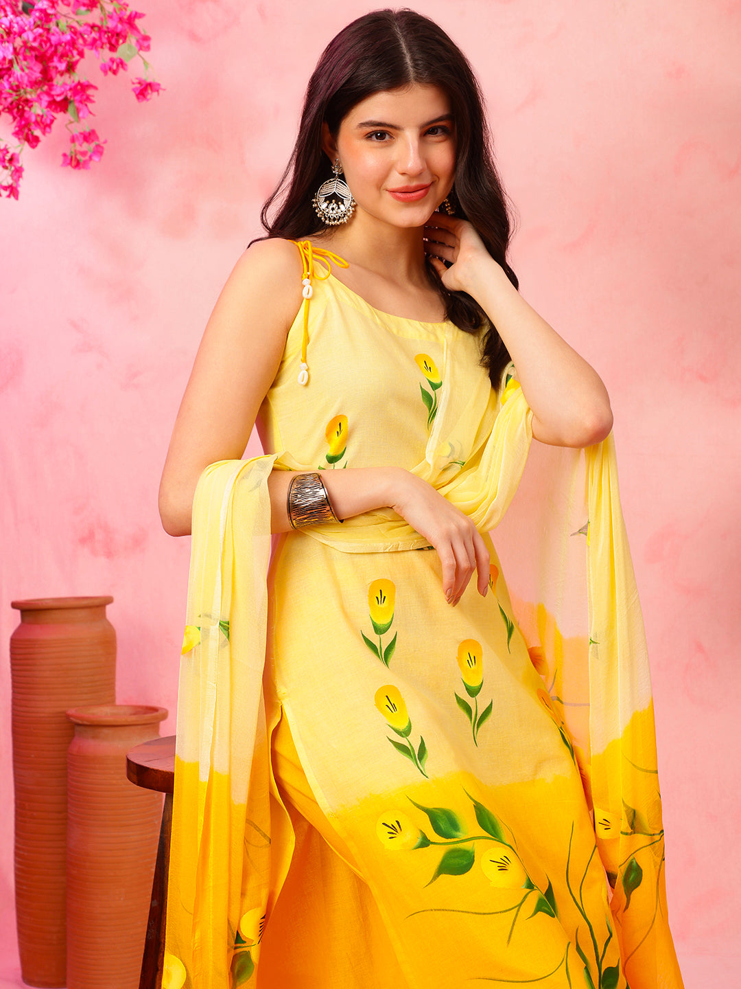 Add a vibrant touch to your ethnic collection with this EthniFlair Phulkari Printed Kurta with Pyjamas & Dupatta. Designed in a bright yellow shade, this set features a soft cotton kurta adorned with a beautiful Phulkari print and an artistic brush-paint effect on the front panel. The breathable cotton pyjamas ensure comfort, while the lightweight Nazneen dupatta is enhanced with matching brush-paint detailing, completing the elegant traditional look. Ideal for festive wear, family gatherings, and cultural events, this set offers a perfect blend of comfort, color, and craftsmanship.