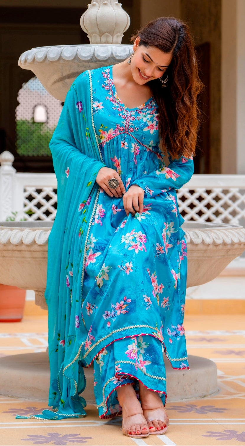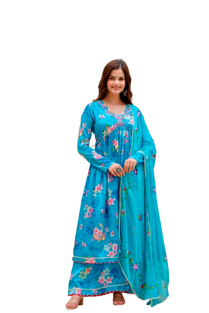 Elevate your festive wardrobe with this beautifully embellished and embroidered A-line kurta set. Crafted with intricate detailing, the kurta features delicate embroidery and subtle embellishments that add a touch of elegance to every occasion.The A-line silhouette offers a flattering, flowy fit, paired with comfortable bottoms to complete the look.