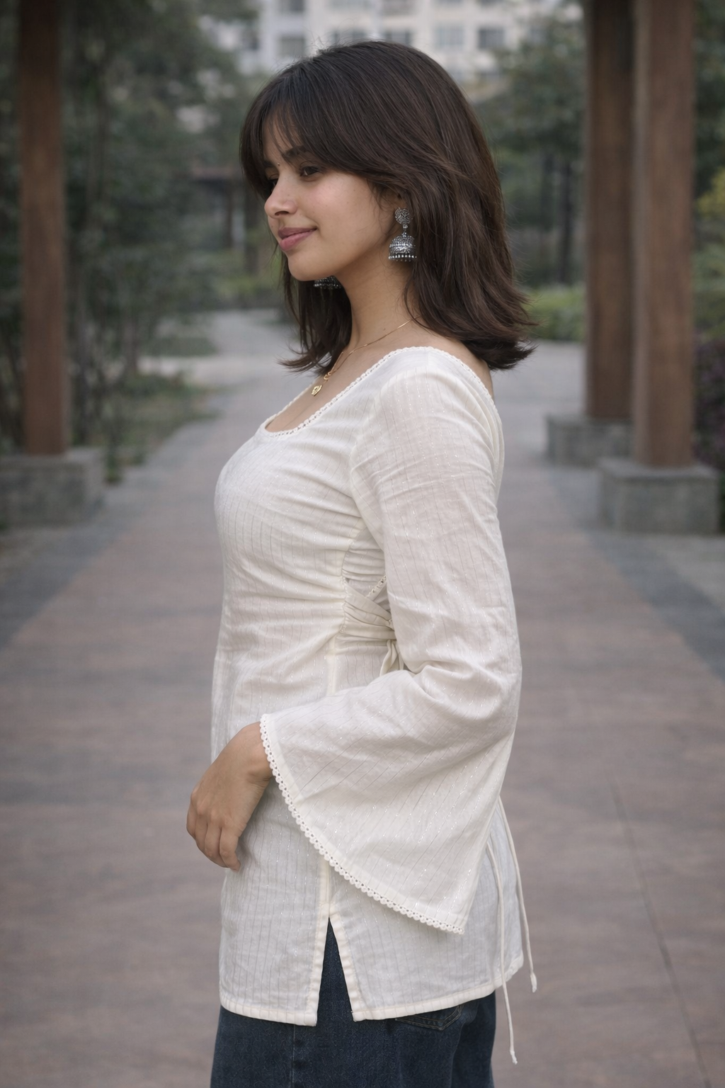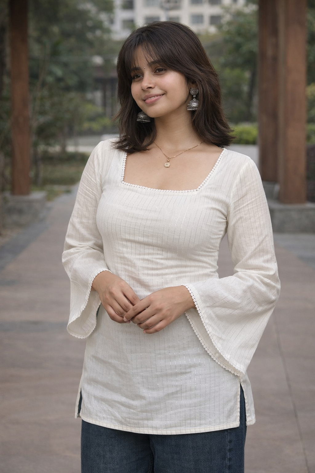 Elevate your ethnic wardrobe with this sophisticated cotton kurta, crafted from a premium cotton-lurex blend that catches light beautifully. The square neckline offers a modern silhouette, while the back tie-up detail adds an elegant, adjustable fit. Flared sleeves provide graceful movement and a flattering drape. Perfect for festive occasions, casual gatherings, or everyday wear, this kurta seamlessly transitions from day to evening. The lurex shimmer brings understated glamour without compromising comfort, making it an essential piece for the discerning wearer.