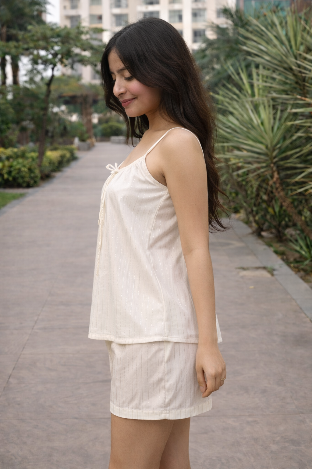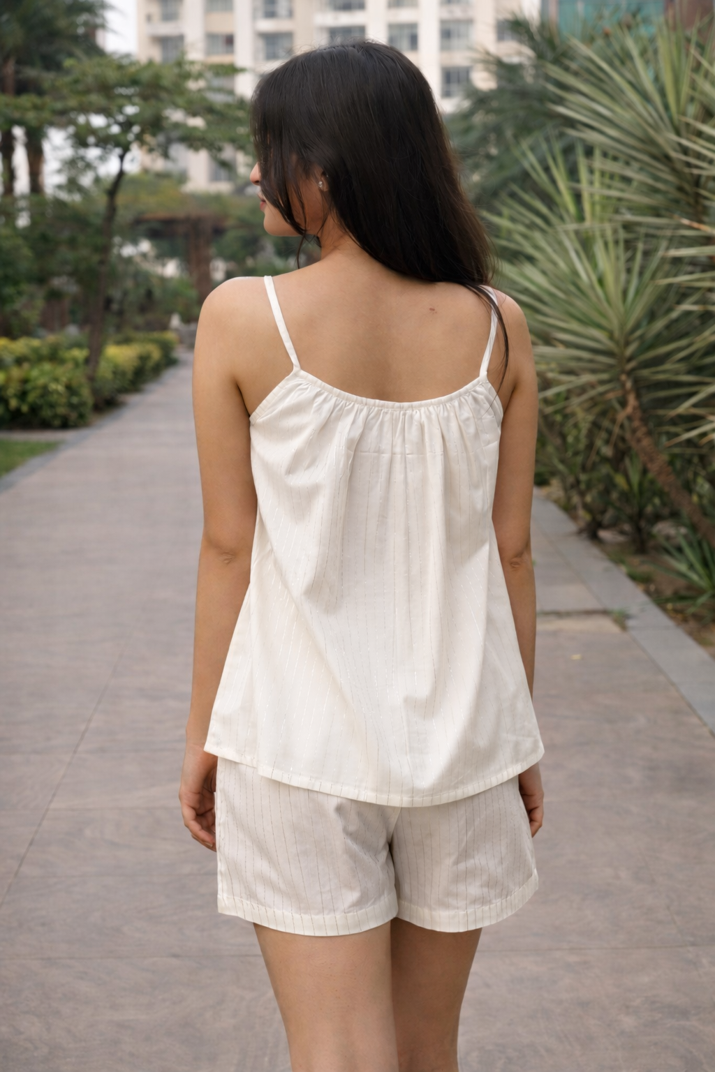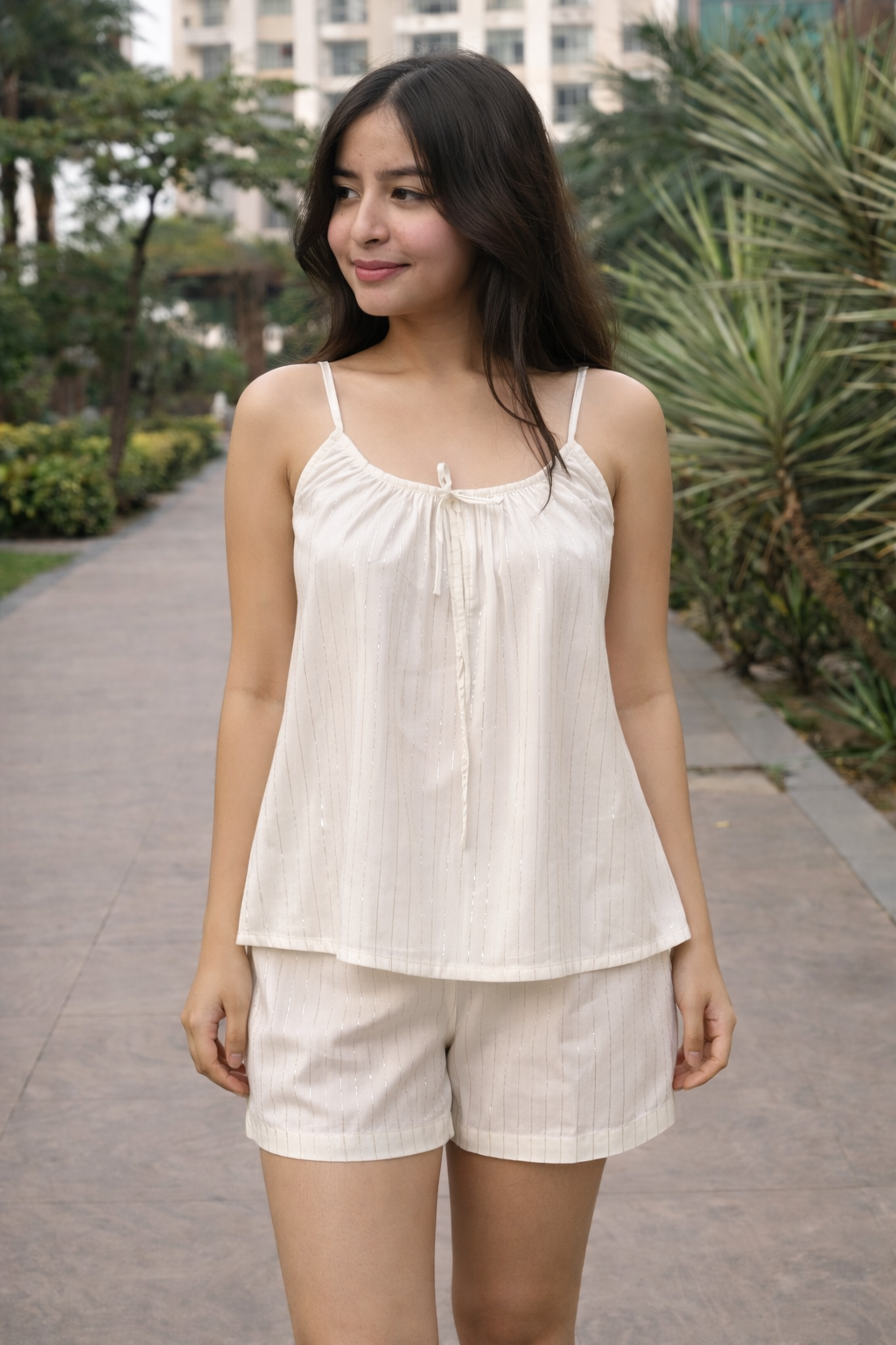 Elevate your warm-weather wardrobe with this sophisticated co-ord set, expertly crafted from a cotton-lurex blend that delivers both comfort and subtle shimmer. The sleeveless top features a refined silhouette, while the coordinating shorts offer a polished, put-together aesthetic ideal for casual outings or relaxed gatherings. The lurex threading adds an understated luminosity without compromising breathability, making this set versatile enough for day-to-evening transitions. Perfect for those seeking effortless style with quality construction.