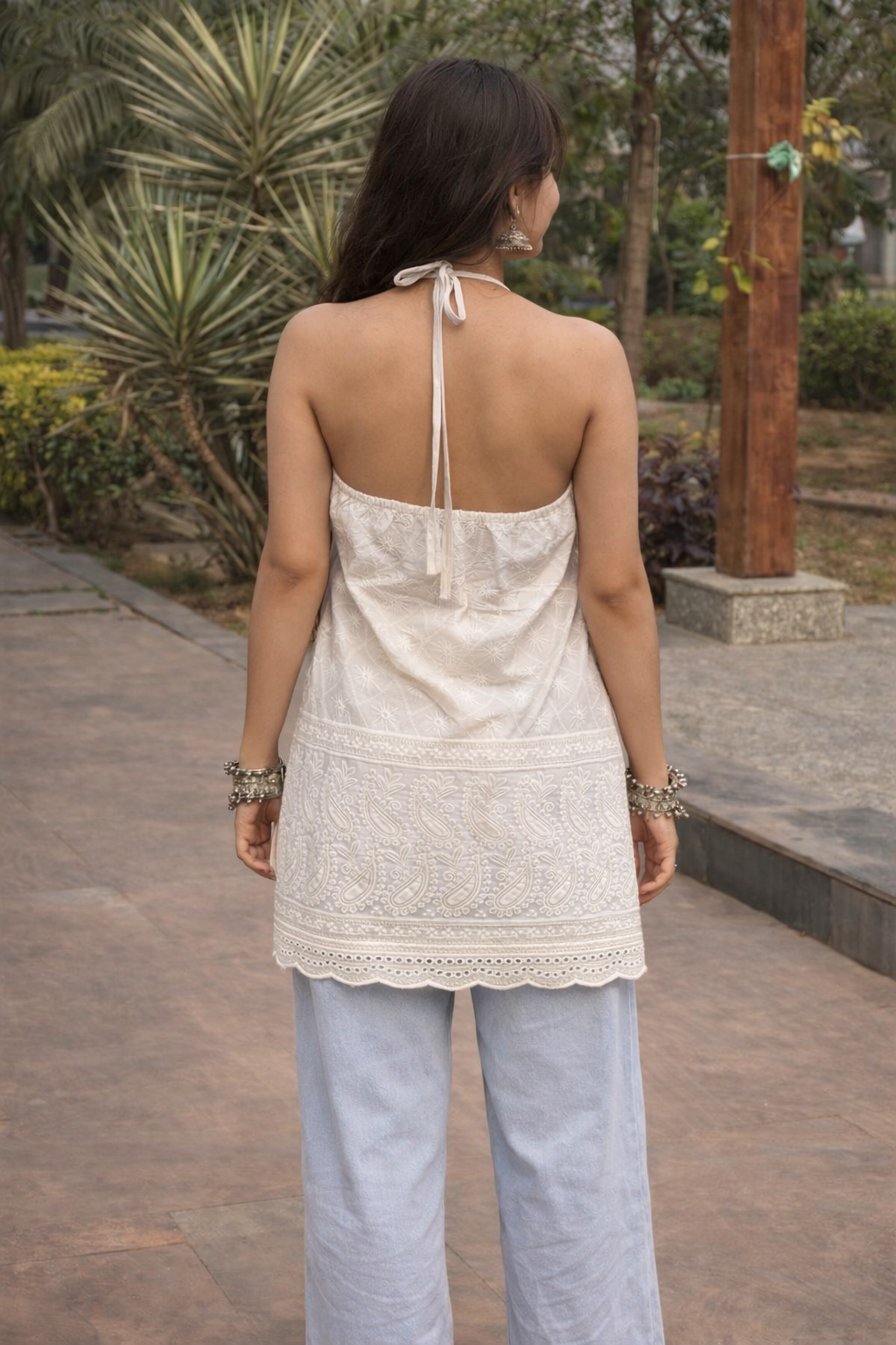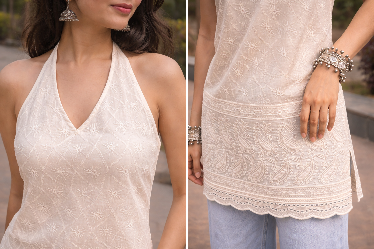 Embrace timeless elegance with this striking chikankari kurti, featuring delicate hand-embroidered detailing that celebrates traditional Indian craftsmanship. The halter neck design offers a contemporary silhouette while the open back creates an effortlessly sophisticated look—perfect for festive occasions, celebrations, or elevated everyday wear. Crafted with precision, this piece balances heritage artistry with modern styling, making it an essential addition to any ethnic wardrobe. Versatile enough to pair with traditional bottoms or contemporary pieces, it's a statement of refined taste and cultural appreciation.