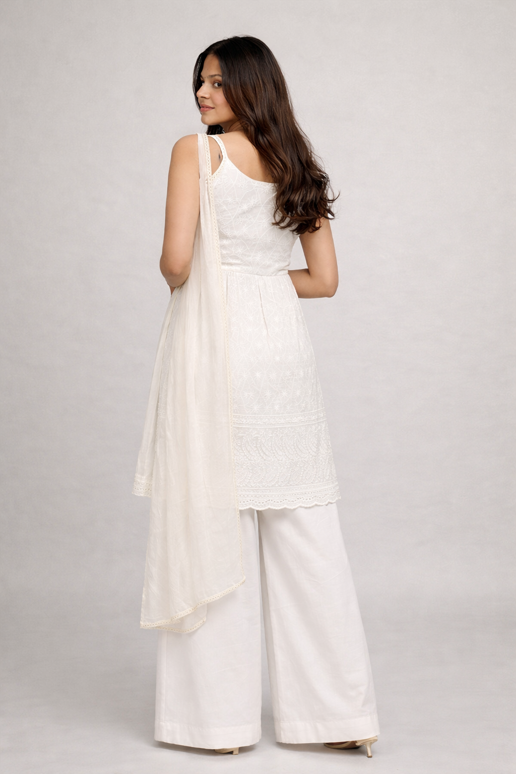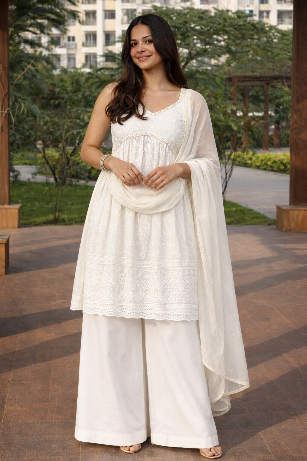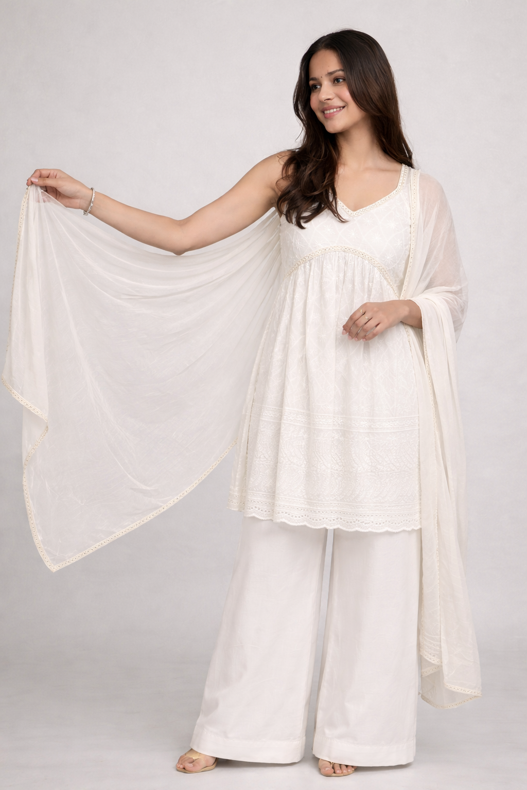 EthniFlair's Chikankari Sleeveless Empire Kurti pairs timeless hand-embroidered elegance with contemporary silhouette. The empire waistline flatters while the sleeveless cut offers breathable comfort for warm seasons. Coordinating palazzo pants provide graceful drape and ease of movement. The mirror-lace embellished dupatta adds layered sophistication and traditional charm. Crafted with attention to detail, this ensemble celebrates authentic Chikankari artistry—ideal for festive occasions, celebrations, or elevated everyday wear. A versatile investment piece that bridges heritage craftsmanship with modern styling.