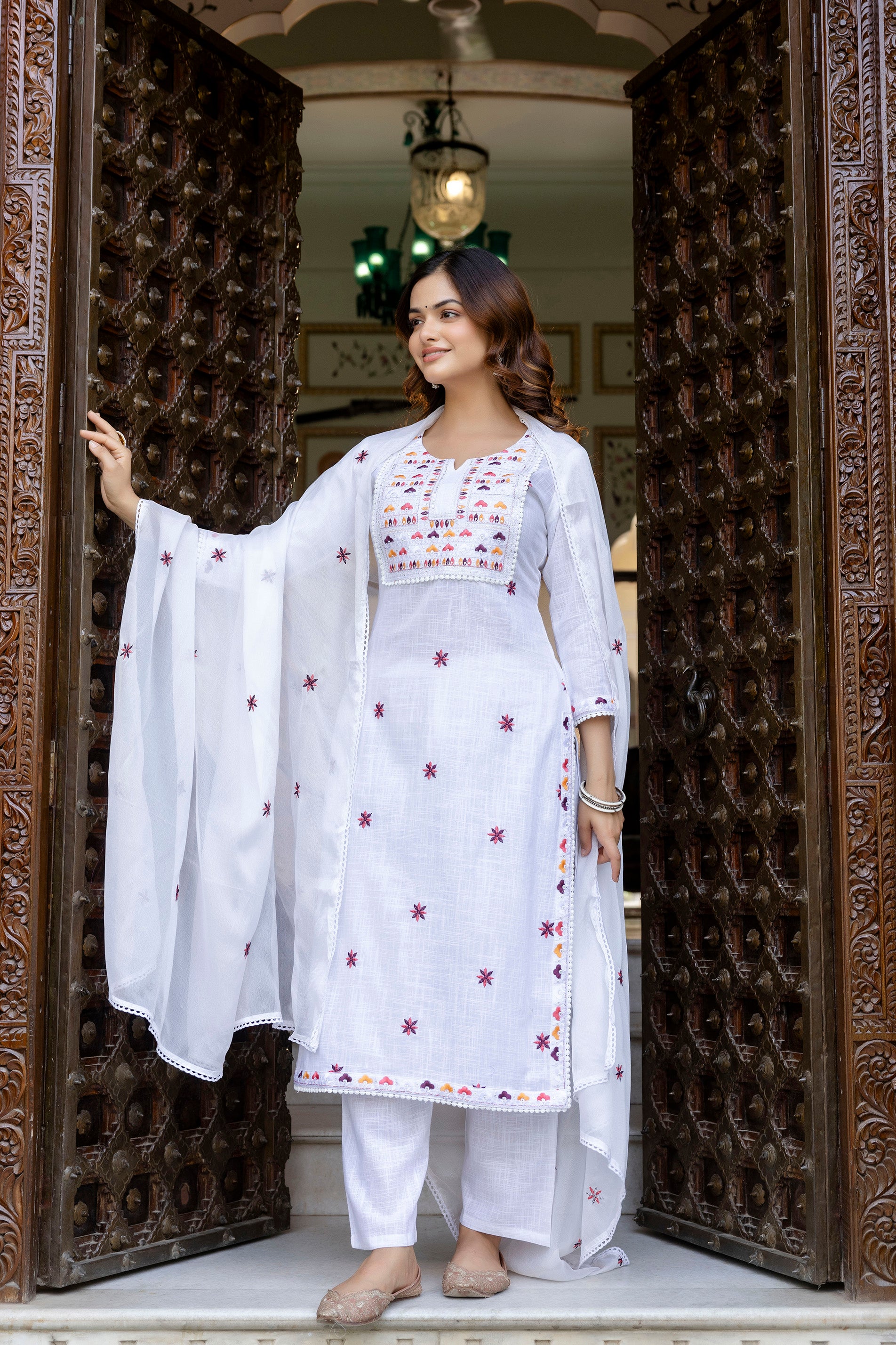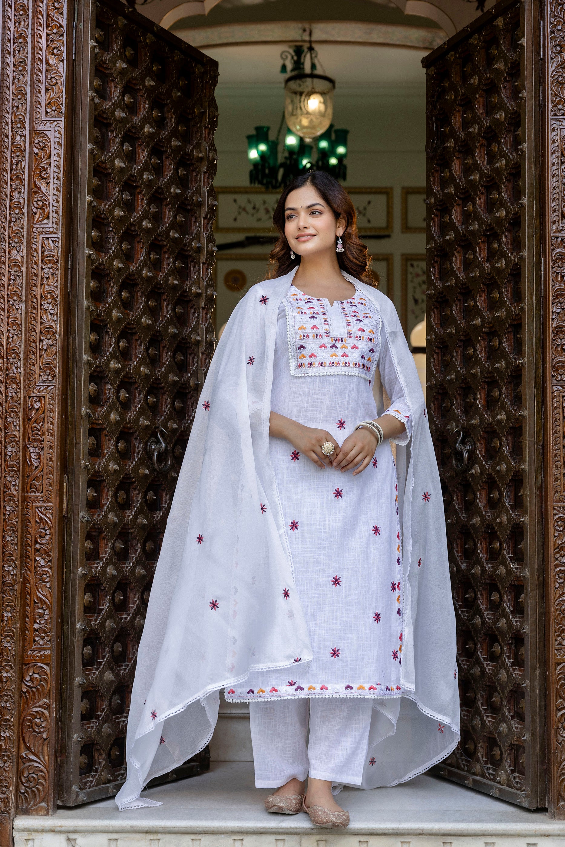This EthniFlair White Straight Kurta Set blends traditional embroidery with contemporary styling. Crafted from soft cotton slub, the kurta features a notch neck design and intricate embroidery on the front panel, adding a refined and festive touch. Paired with matching cotton slub trousers and a lightweight Chinon dupatta adorned with delicate embroidery, this ensemble is perfect for family gatherings, festive occasions, and semi-formal events.