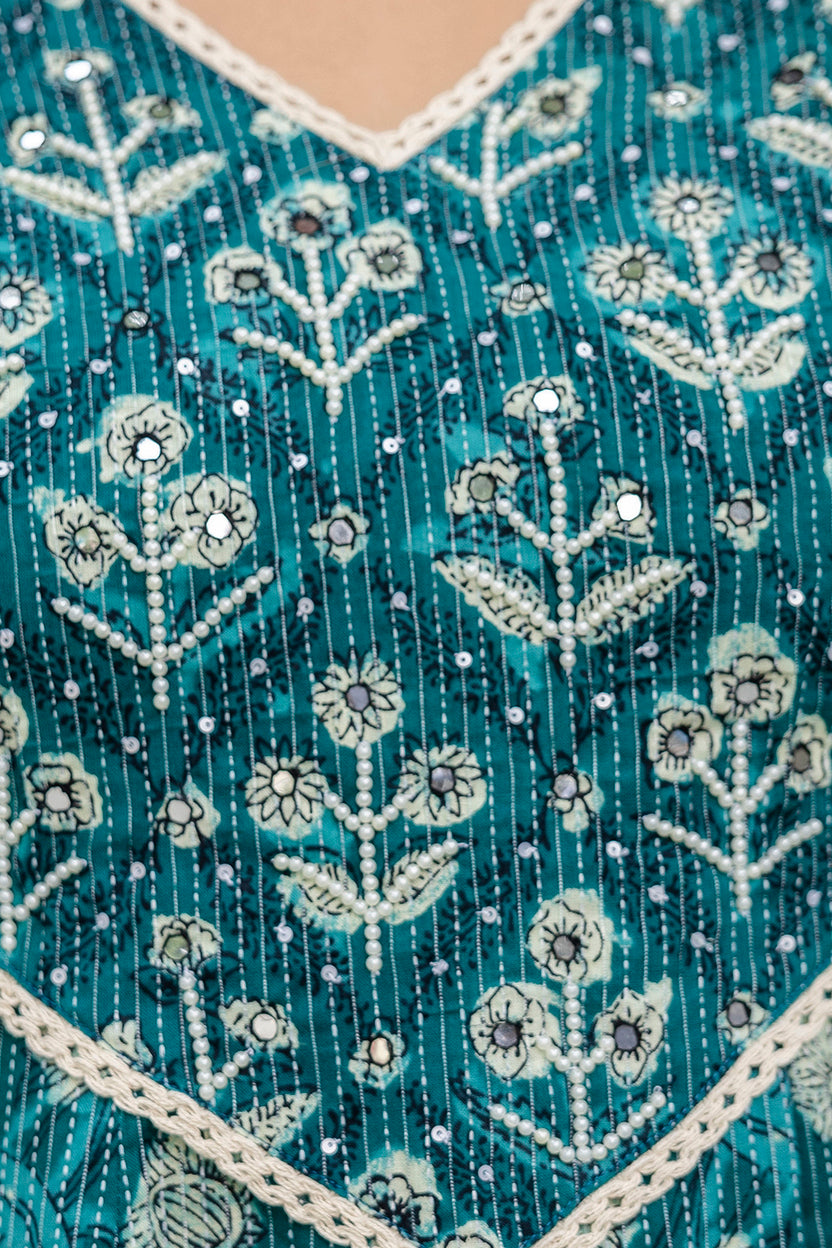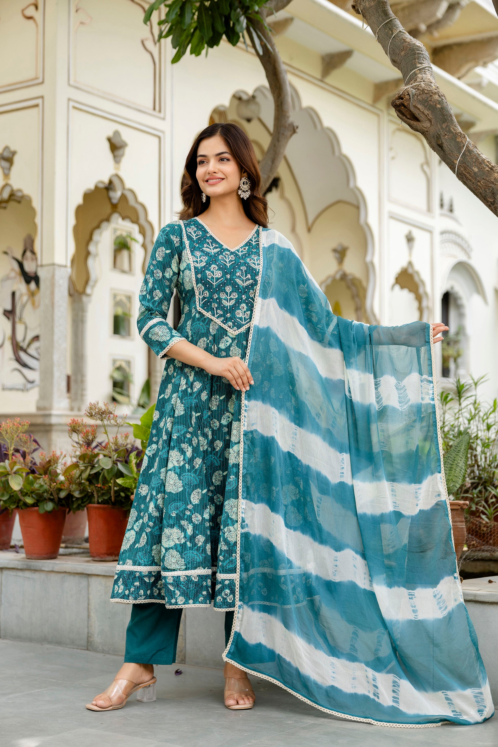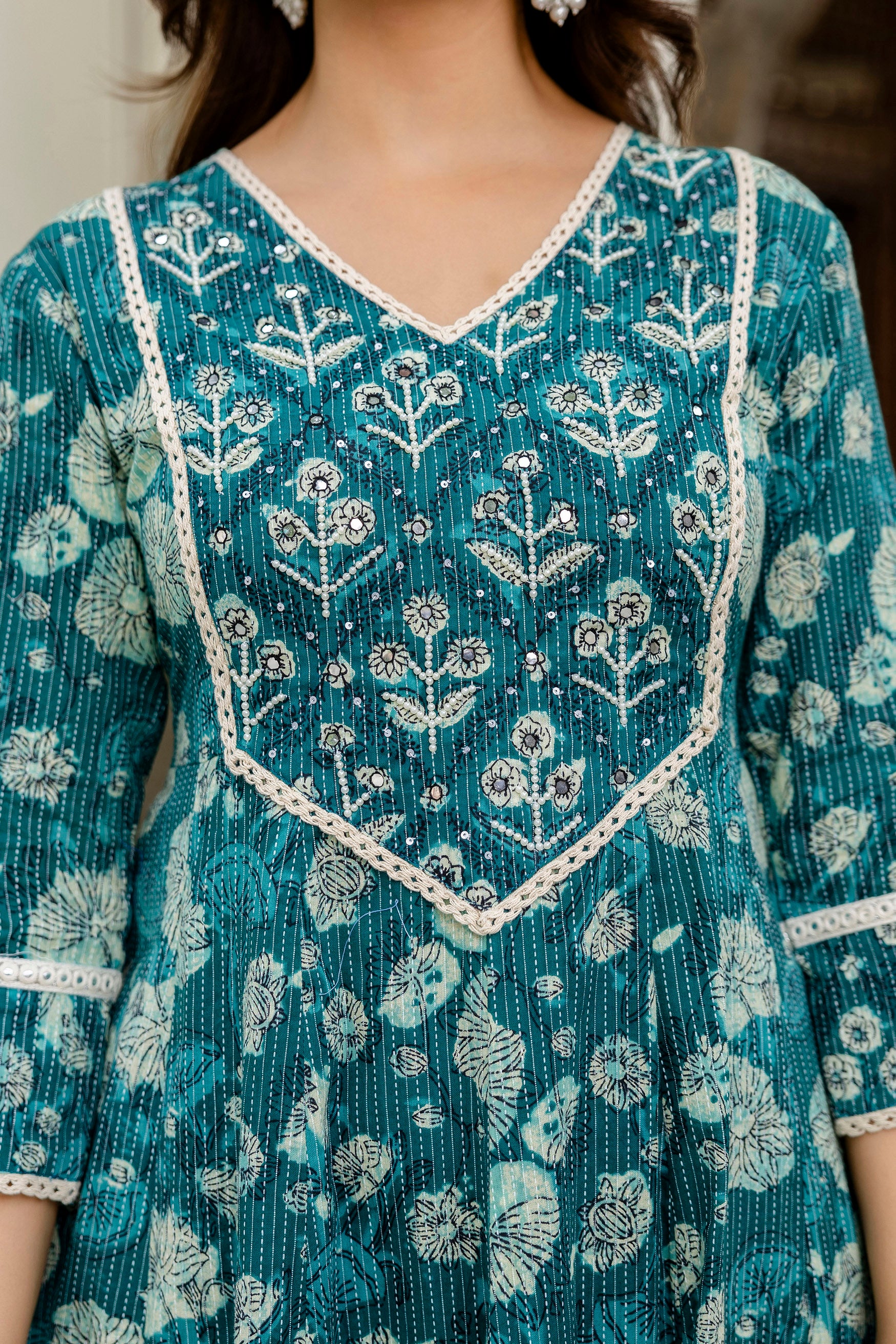 Enhance your ethnic style with this beautifully crafted EthniFlair embroidered kurta set. Made from breathable Cotton, the kurta features hand work on the yoke and elegant katha work on the fabric. Paired with comfortable pyjamas and a Nazneen dupatta finished with lace, this set is ideal for festive outings and traditional events.