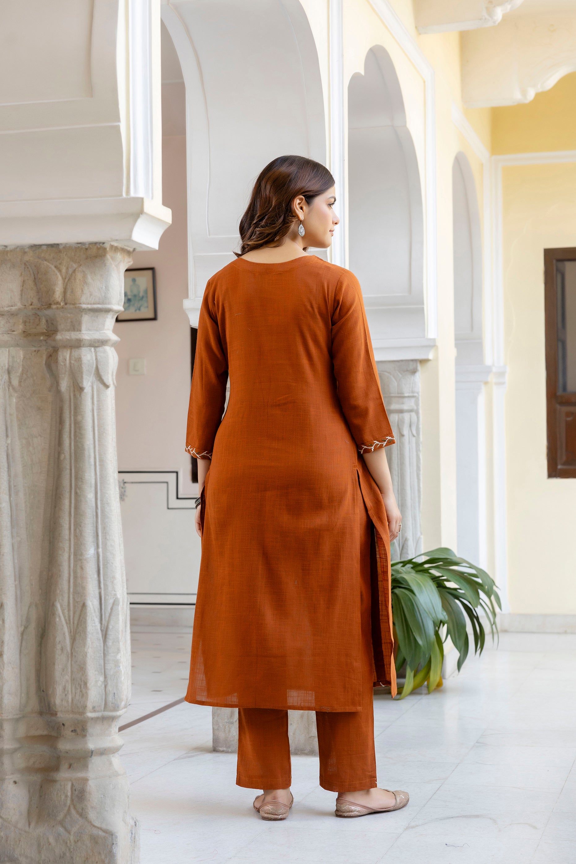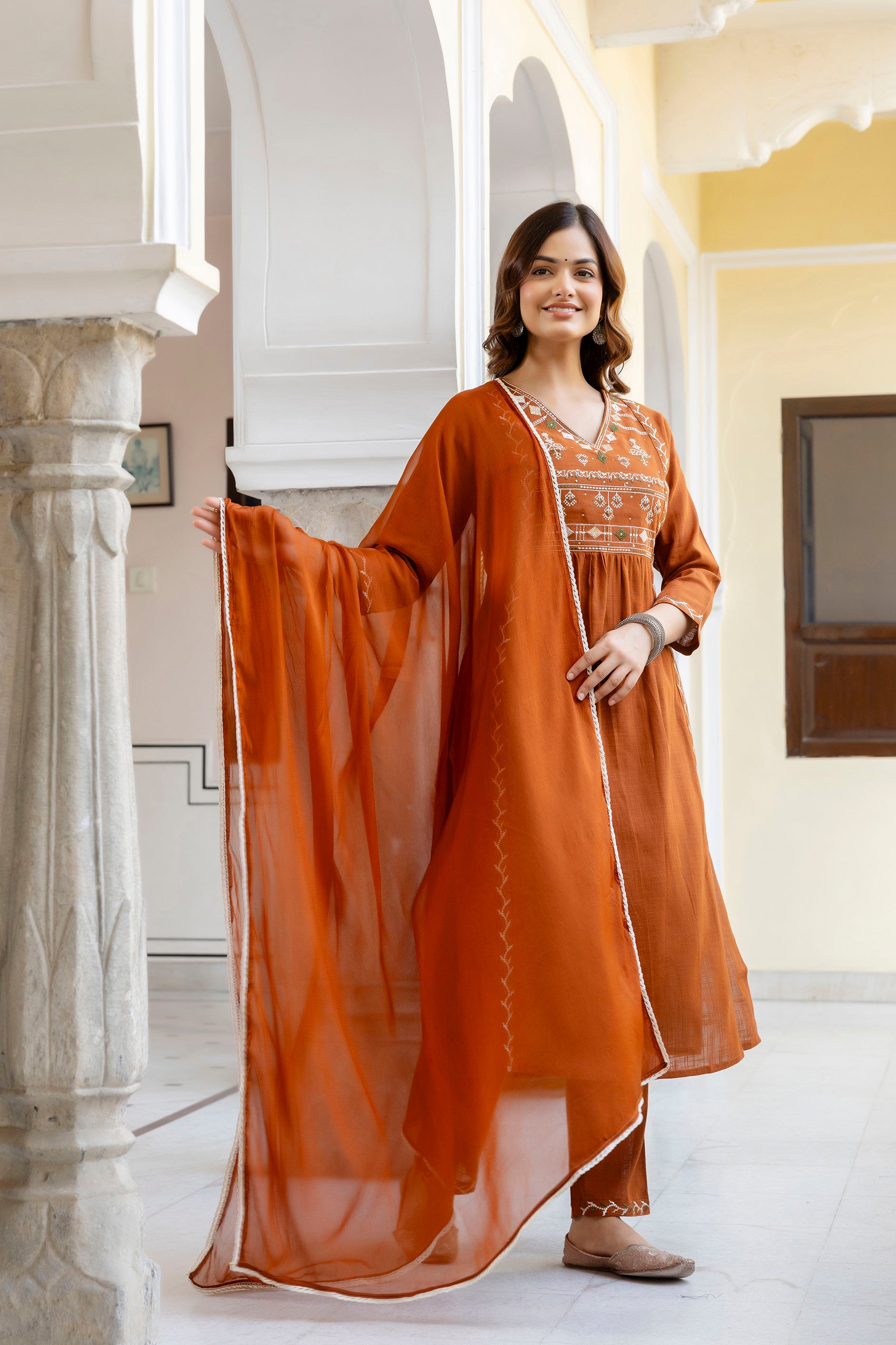 slub, the kurta features elegant pleats and intricate Aari embroidery with ethnic motifs on the front panel, giving it a refined and festive appeal. The set is paired with matching cotton slub bottoms and a lightweight Nazneen dupatta, making it a complete ensemble perfect for family gatherings, festive occasions, and semi-formal events.