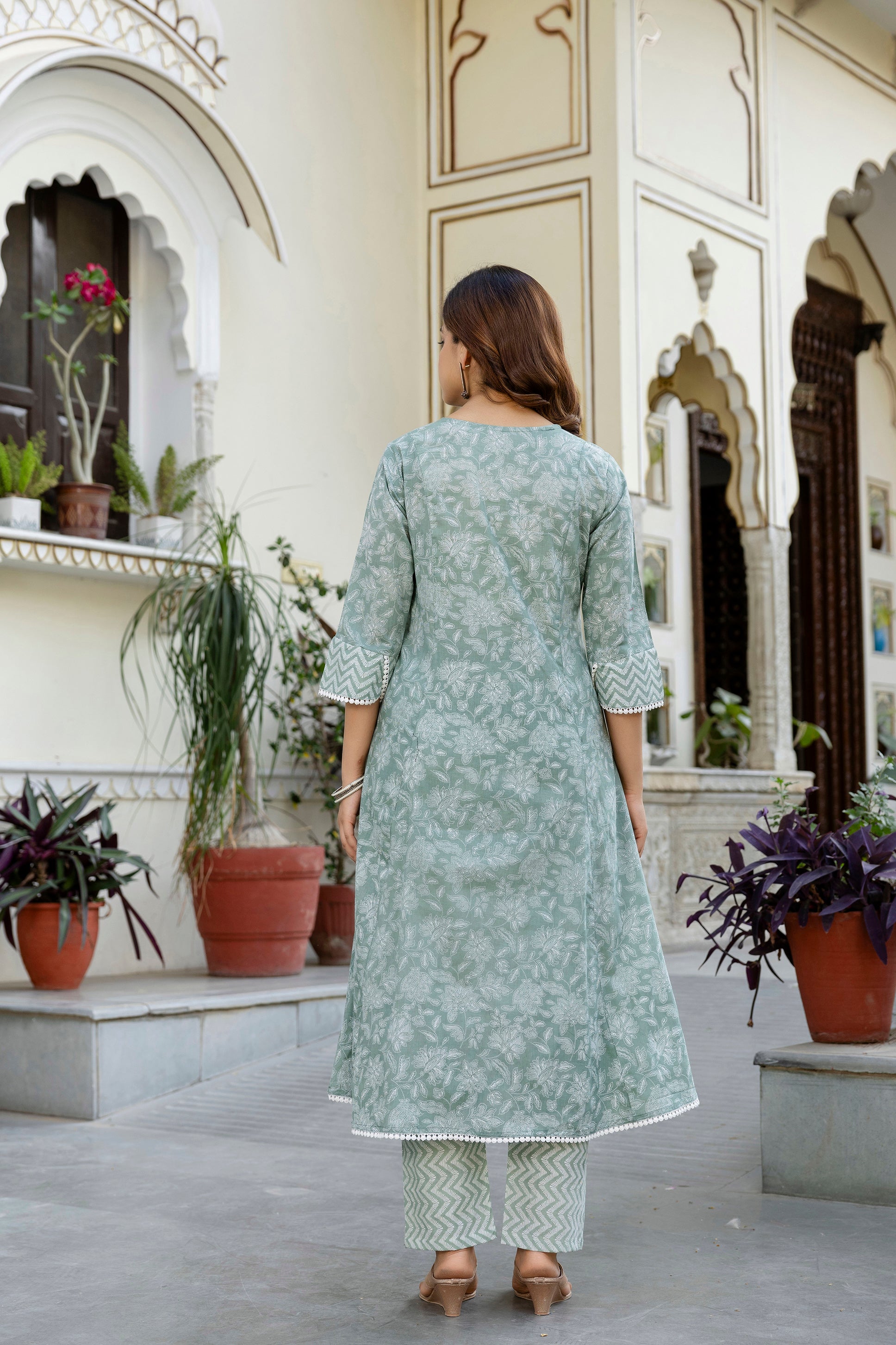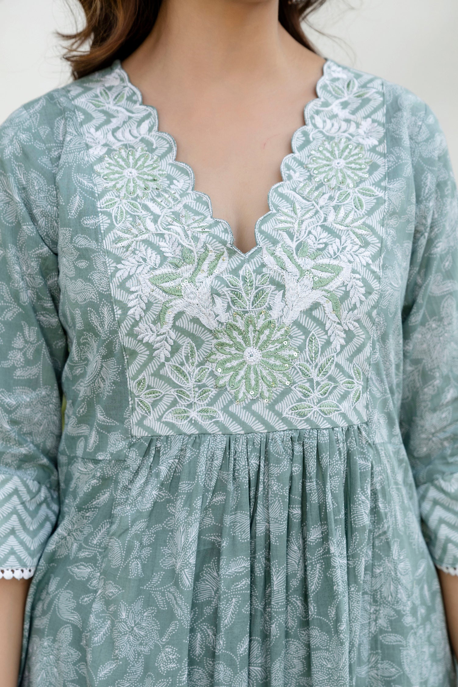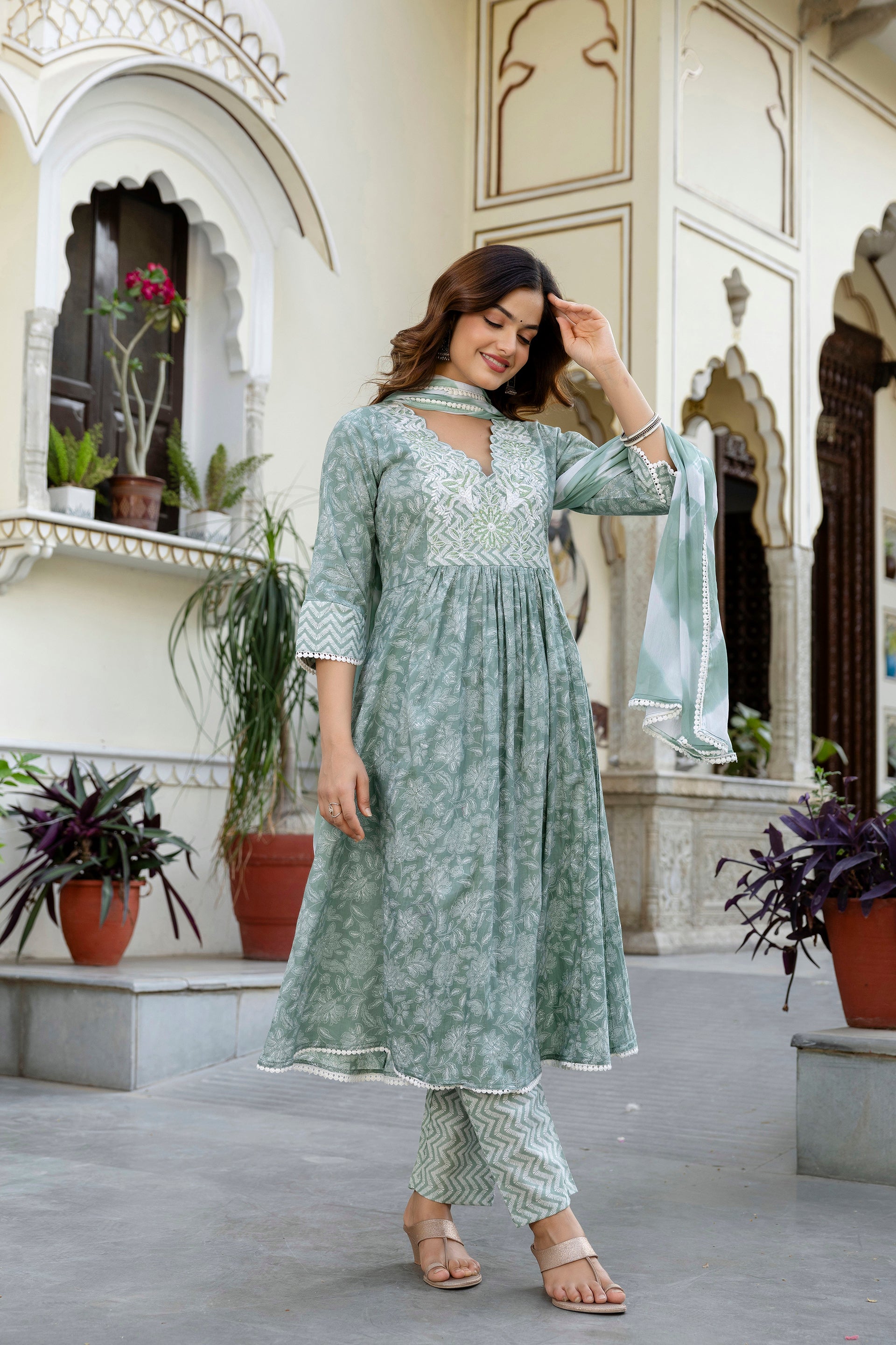 This EthniFlair Green Kurta Set is designed to combine elegance with everyday comfort. Crafted from soft cotton, the kurta features intricate floral embroidery on the front panel, adding a refined traditional touch. The lightweight Nazneen dupatta is enhanced with delicate lace detailing, completing the elegant ensemble. Paired with comfortable cotton pyjamas, this set is ideal for festive occasions, family gatherings, and semi-formal events.