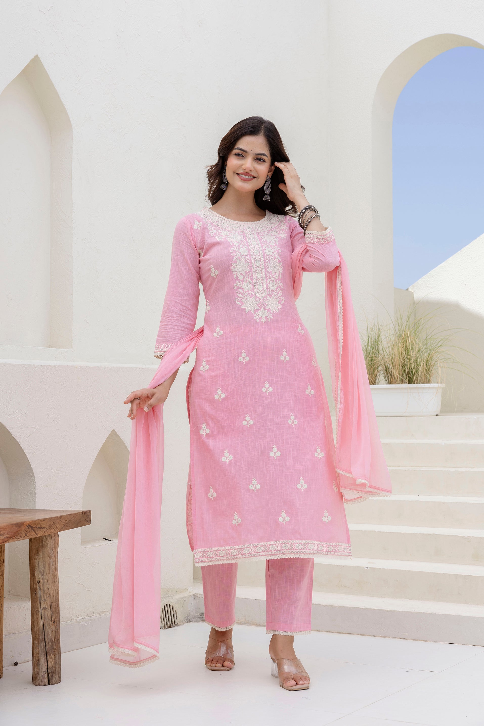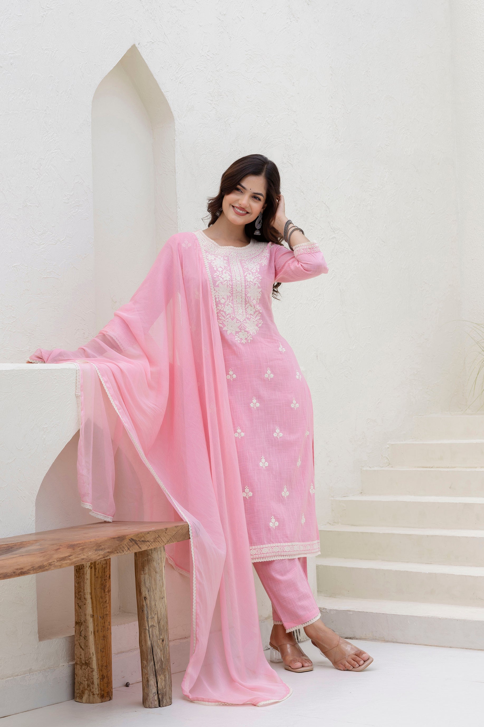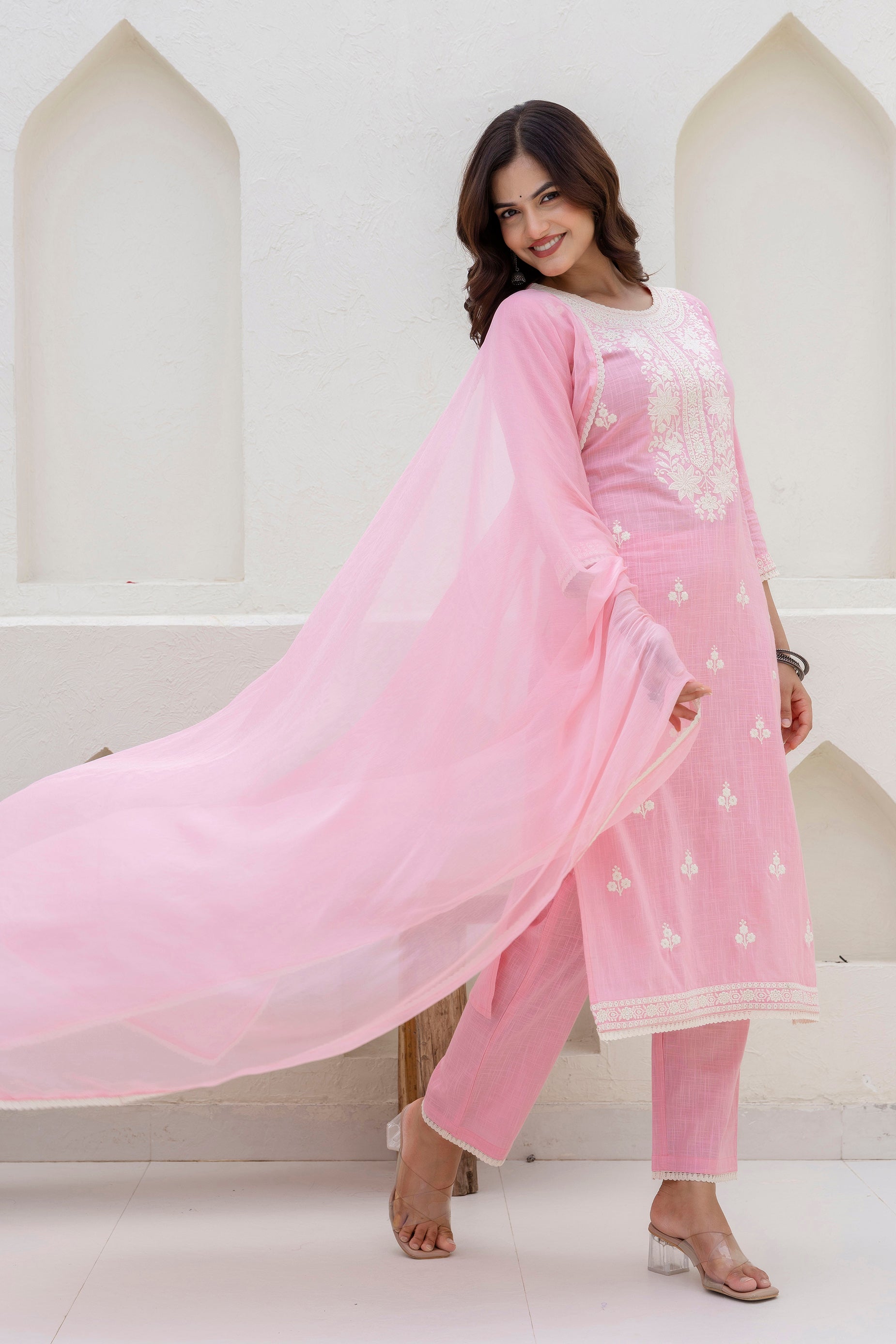 Paired with matching Cotton Slub trousers for a clean and comfortable silhouette, the set is completed with a lightweight Nazneen dupatta, offering a soft and graceful drape. Perfect for festive gatherings, office wear, or everyday outings, this kurta set blends comfort, simplicity, and timeless ethnic charm.