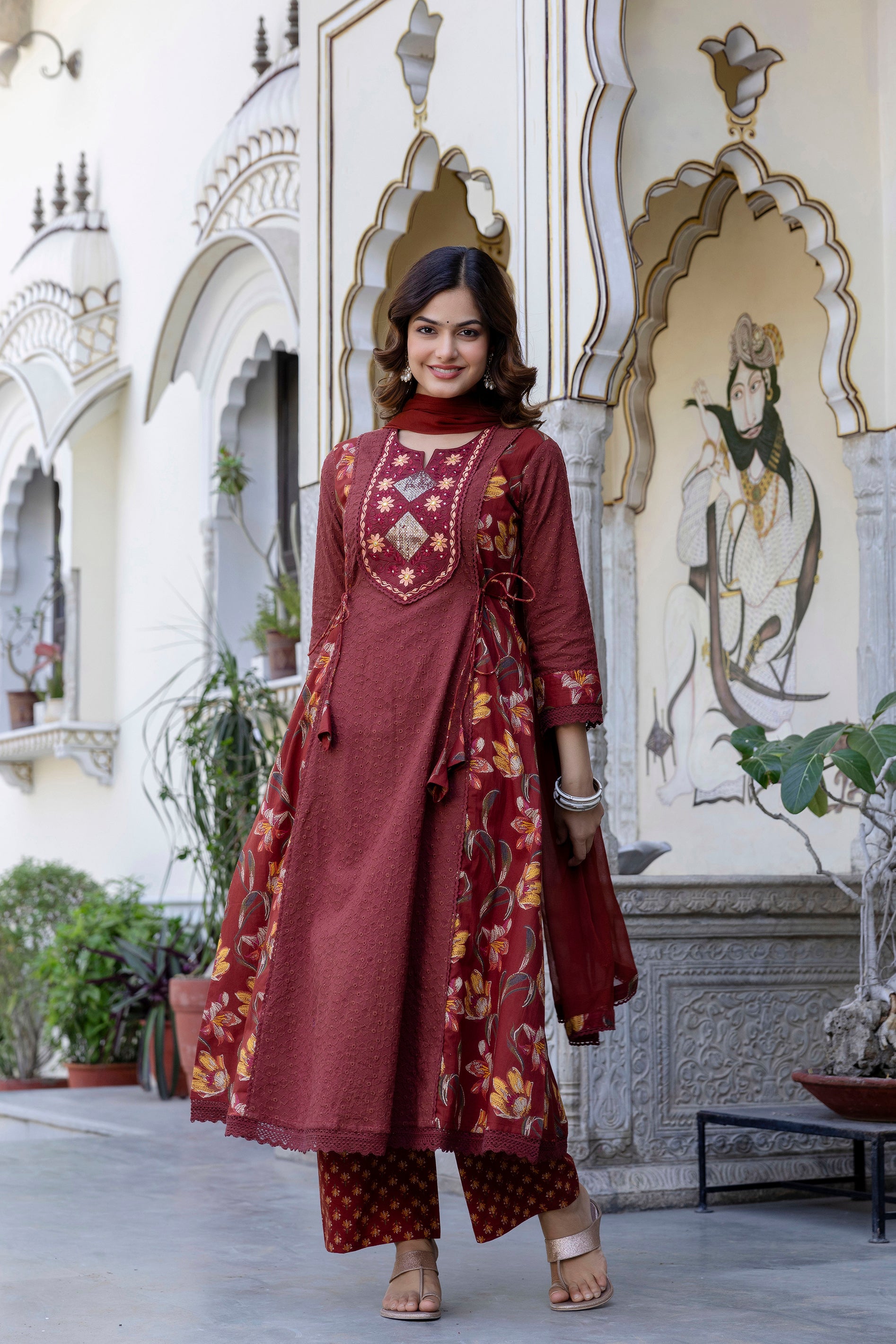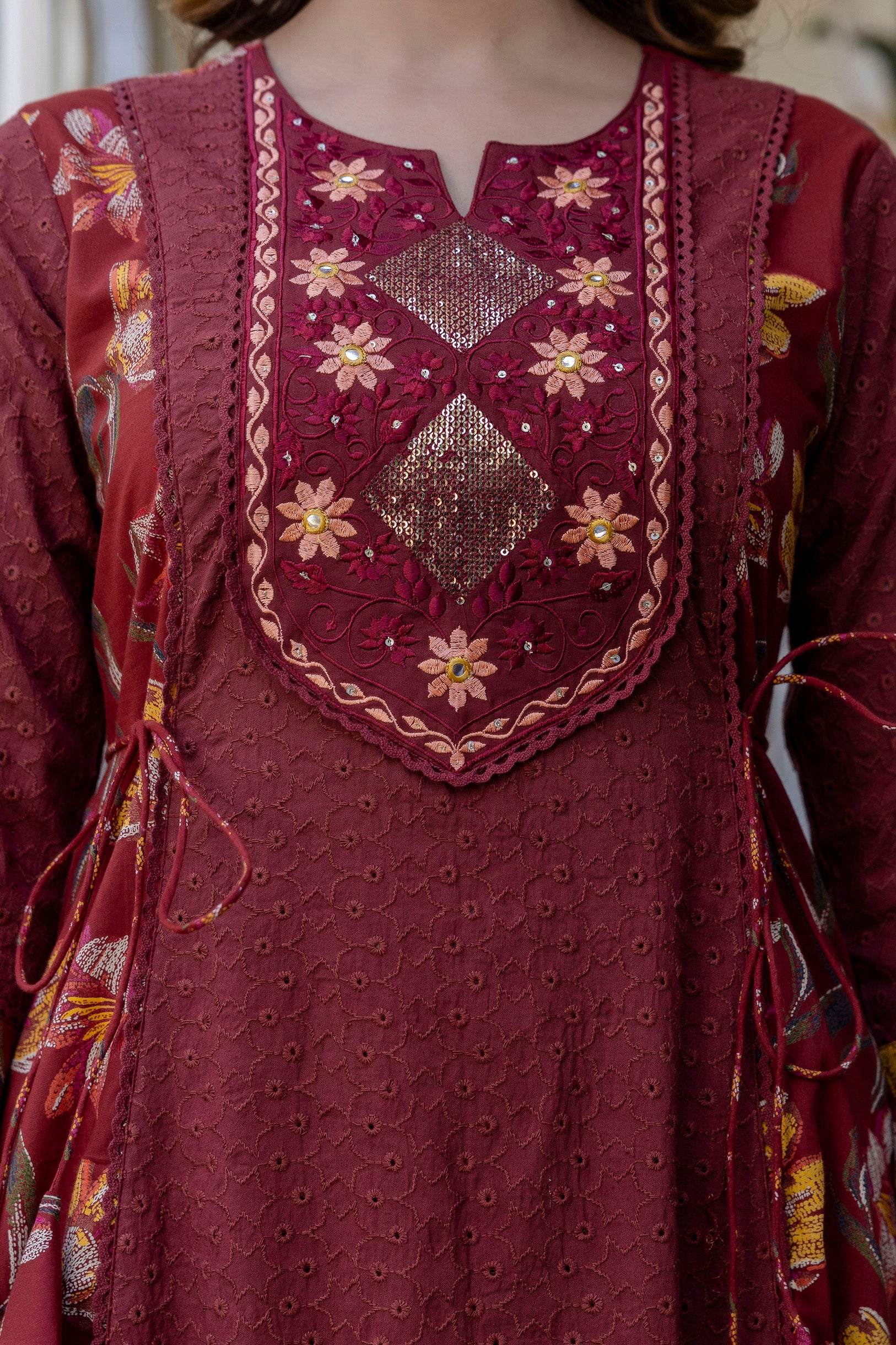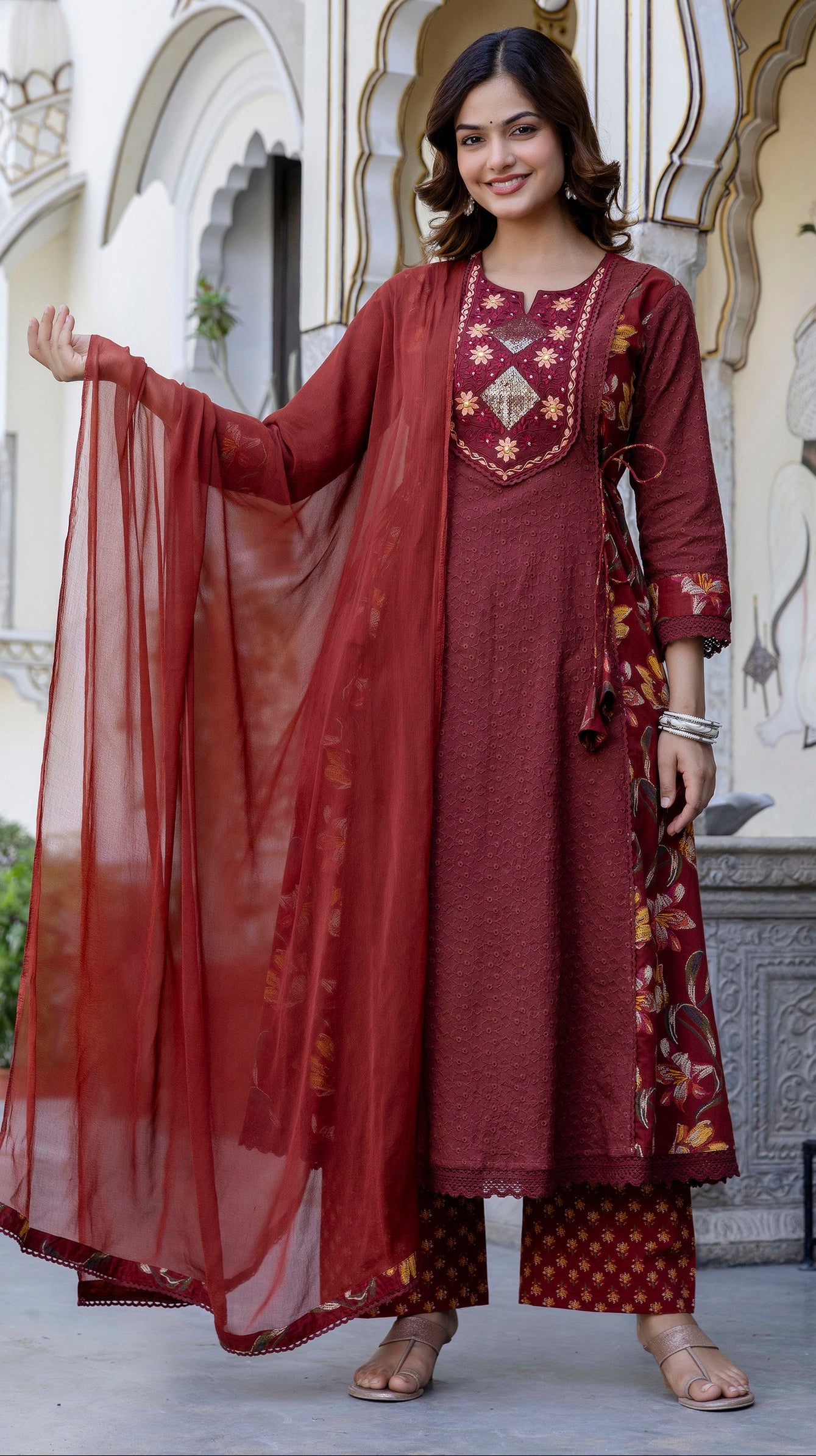 This EthniFlair Maroon Kurta Set blends rich traditional detailing with modern elegance. Crafted from soft and breathable cotton, the kurta features exquisite floral embroidery on the front panel, giving it a refined festive look. The addition of intricate schiffli panels adds beautiful texture and enhances its premium appeal. Paired with comfortable cotton palazzos and a lightweight Nazneen dupatta, this set creates a graceful and complete outfit perfect for festive occasions, family functions, and special celebrations.