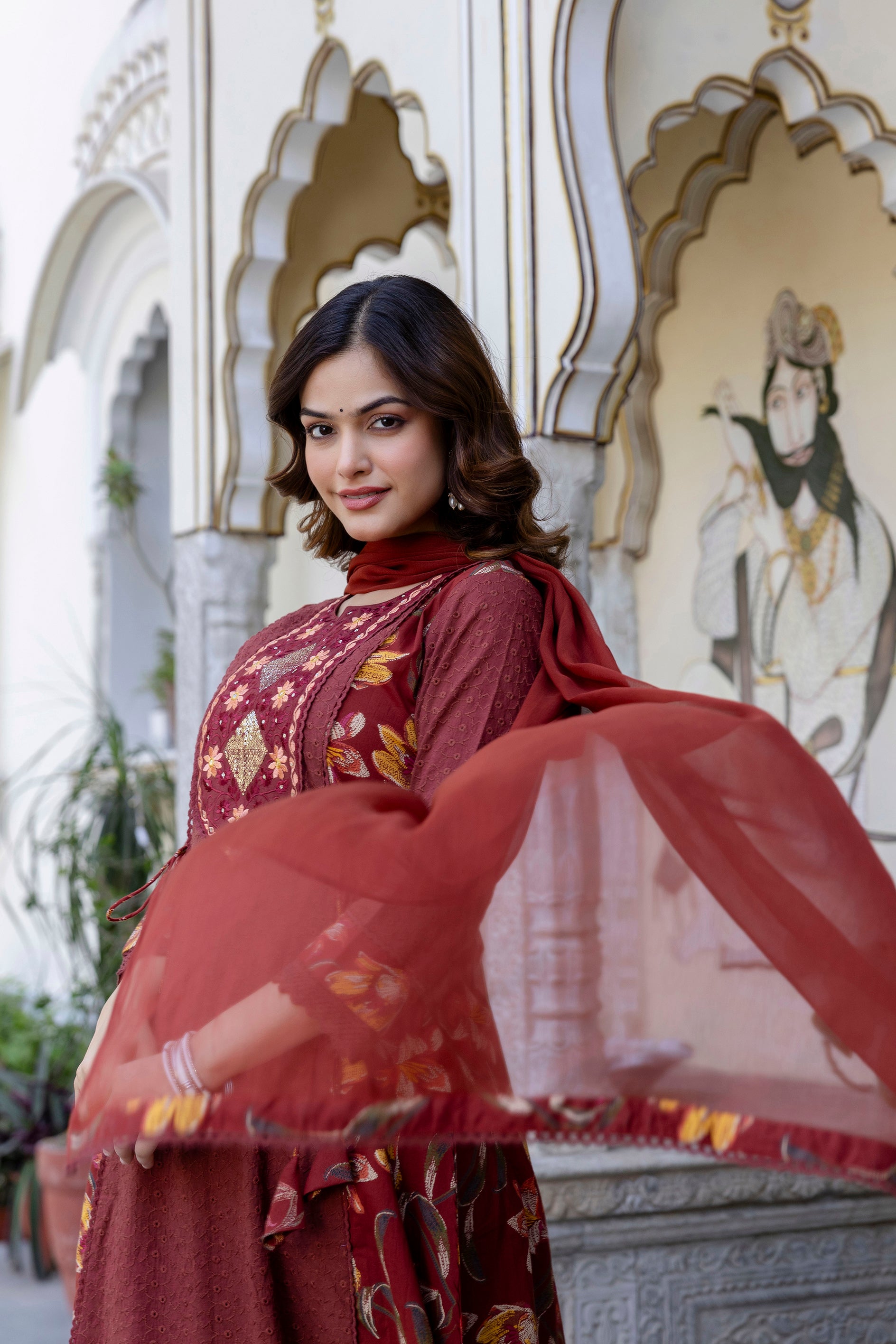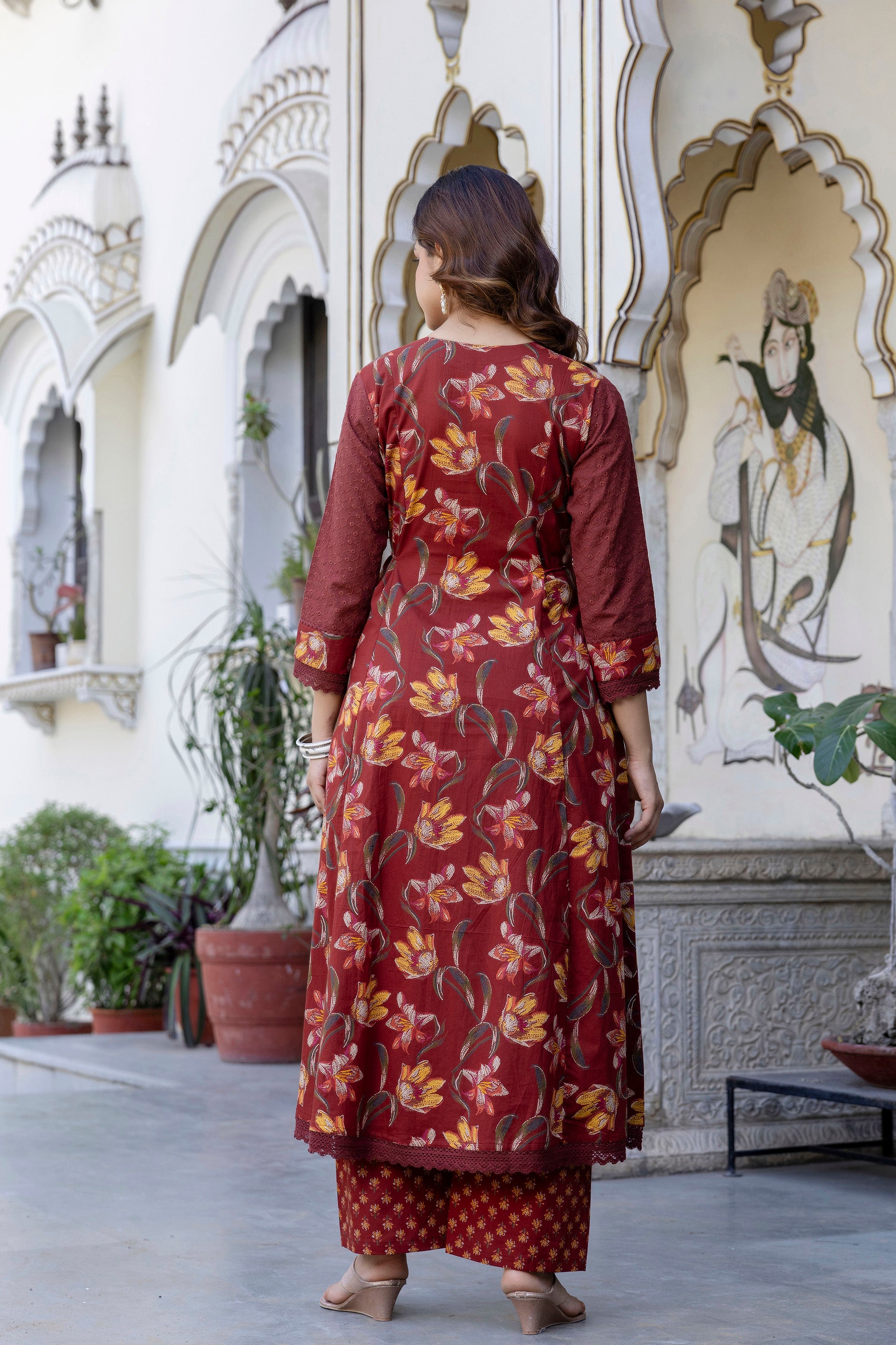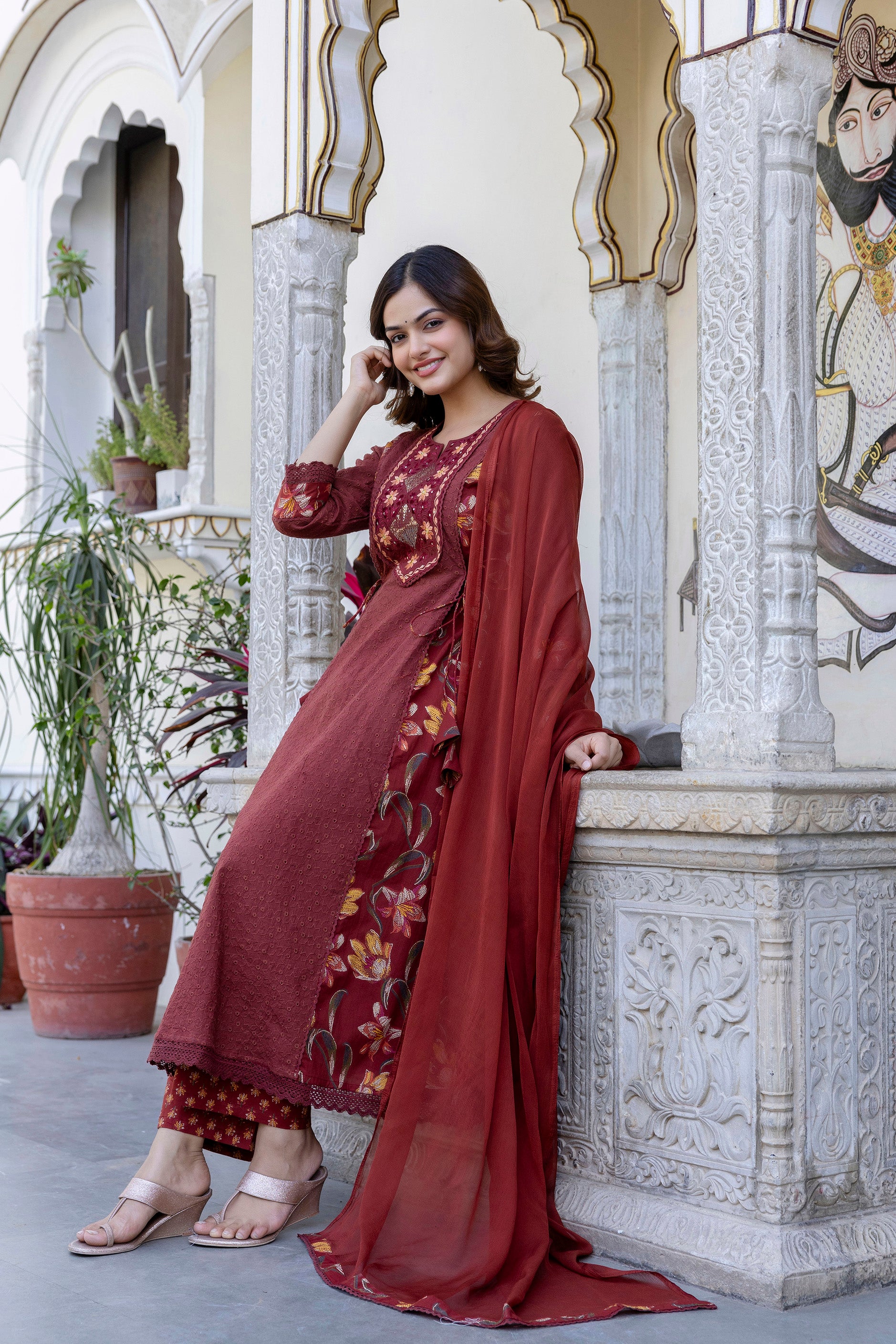 This EthniFlair Maroon Kurta Set blends rich traditional detailing with modern elegance. Crafted from soft and breathable cotton, the kurta features exquisite floral embroidery on the front panel, giving it a refined festive look. The addition of intricate schiffli panels adds beautiful texture and enhances its premium appeal. Paired with comfortable cotton palazzos and a lightweight Nazneen dupatta, this set creates a graceful and complete outfit perfect for festive occasions, family functions, and special celebrations.
