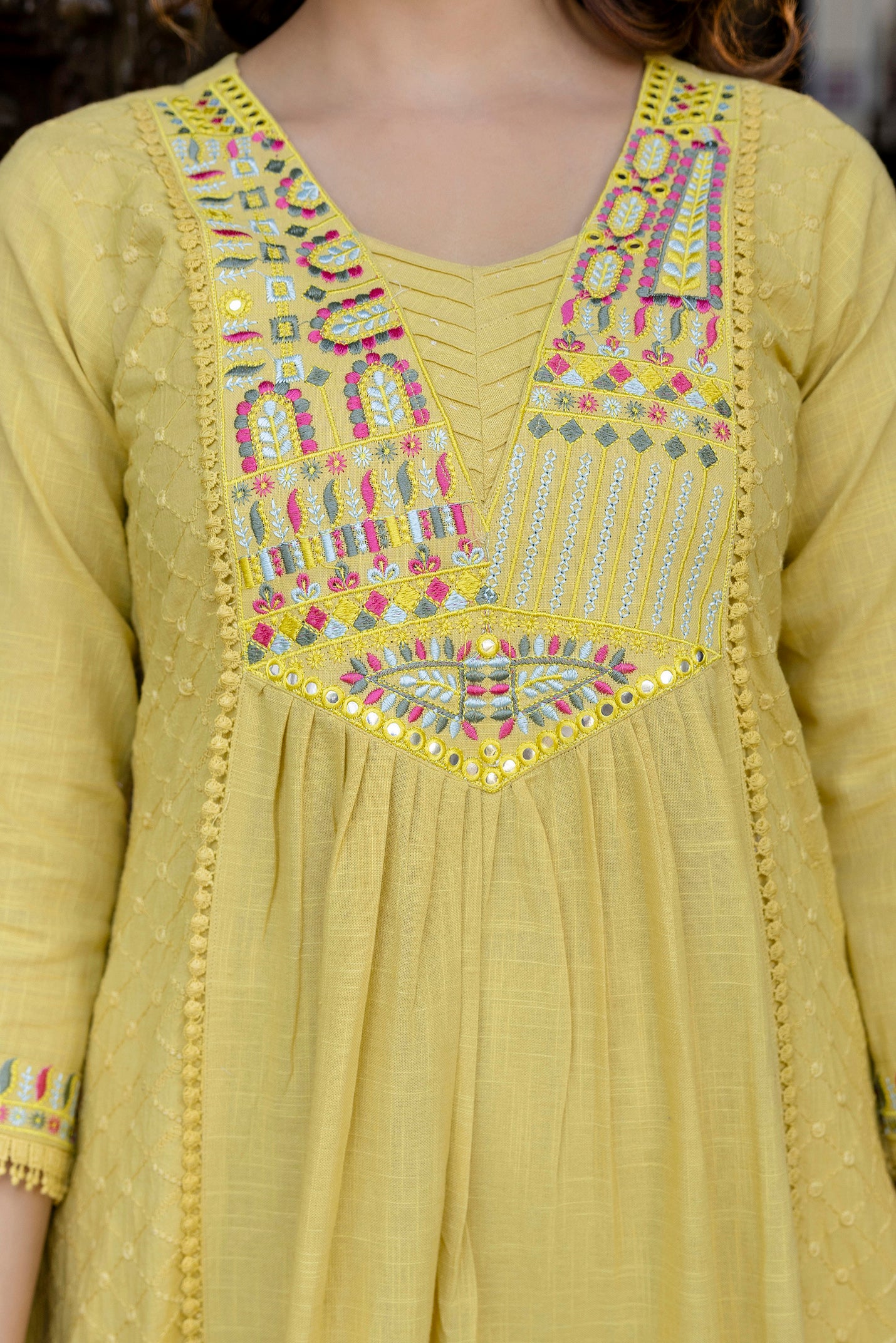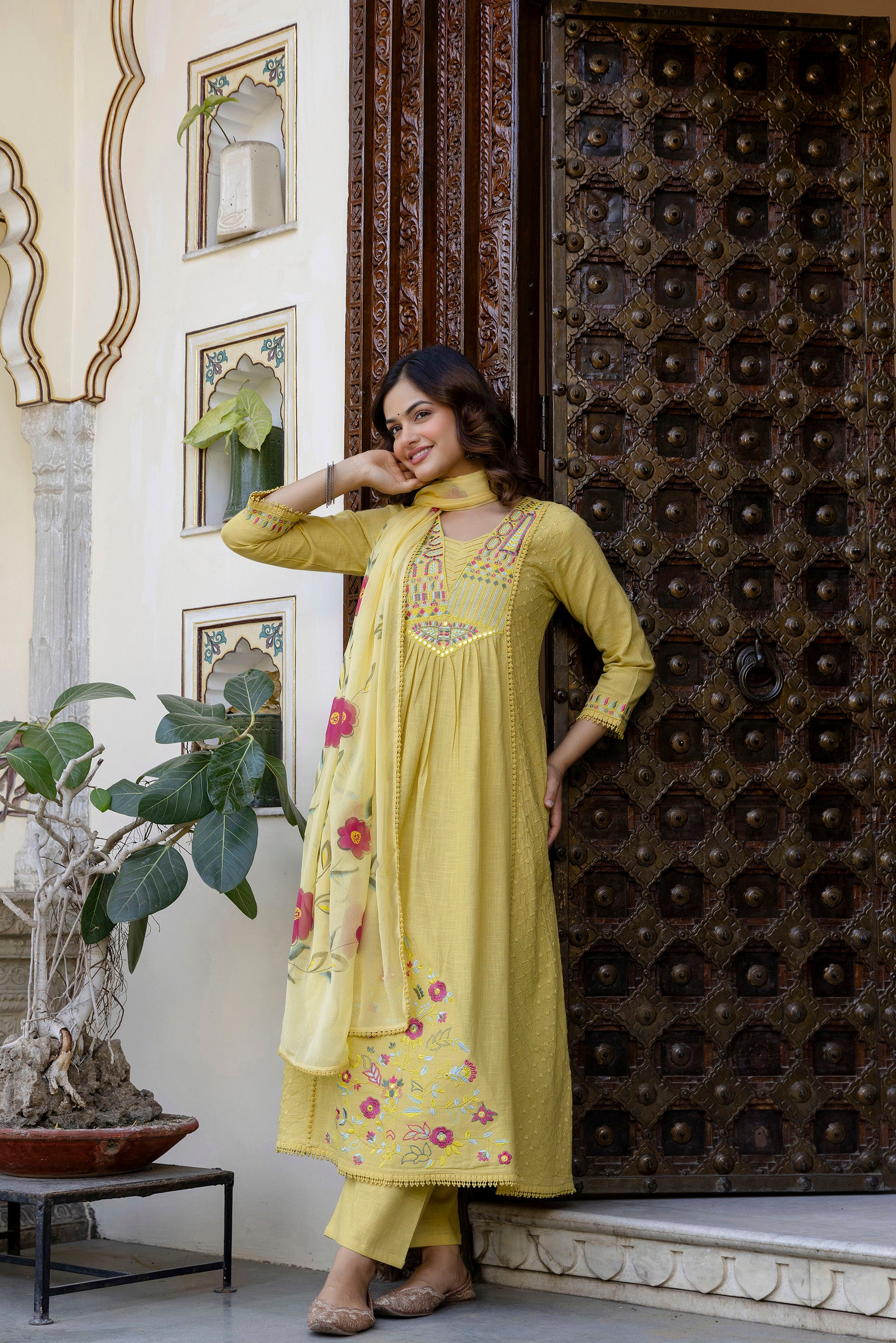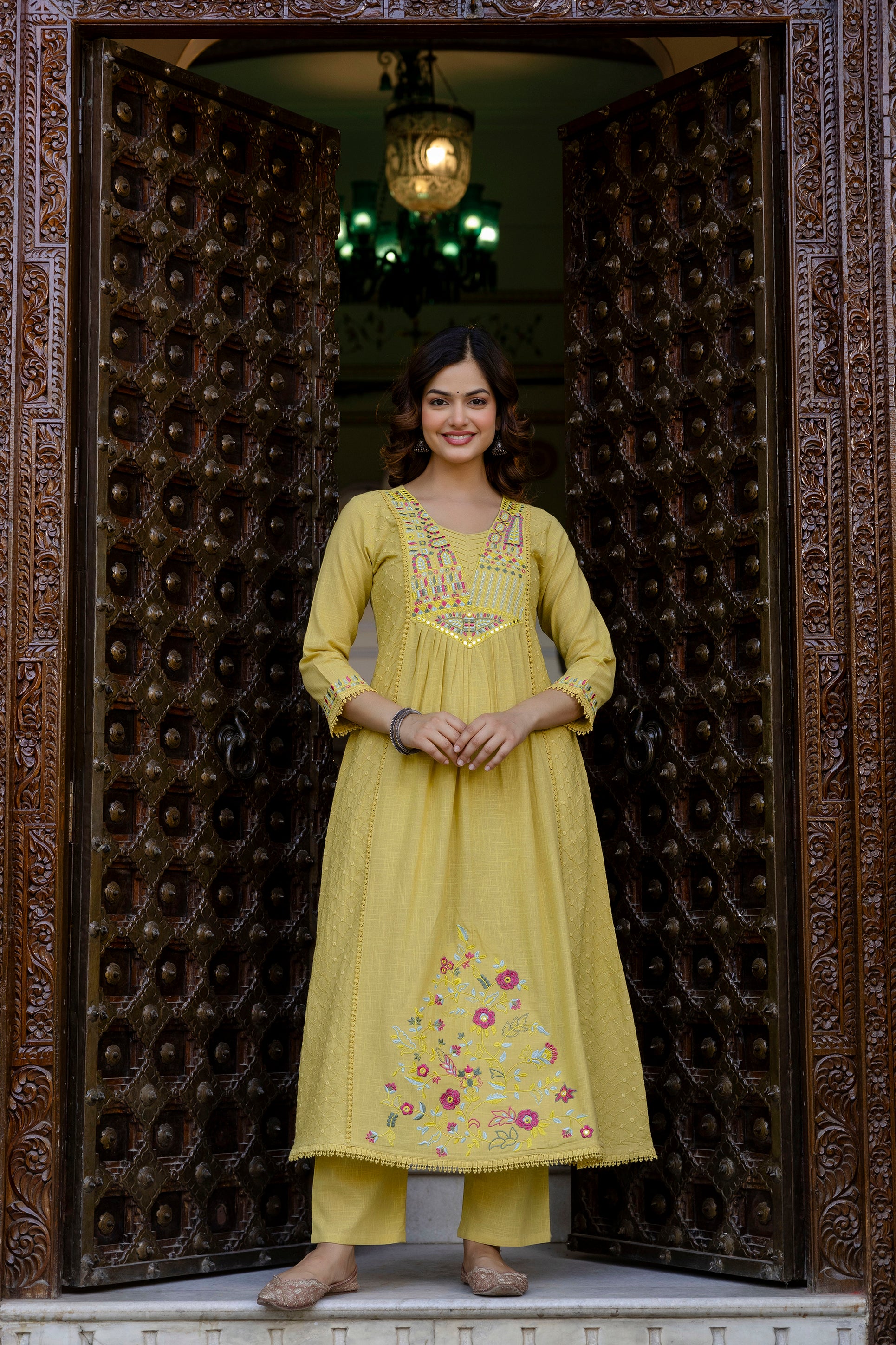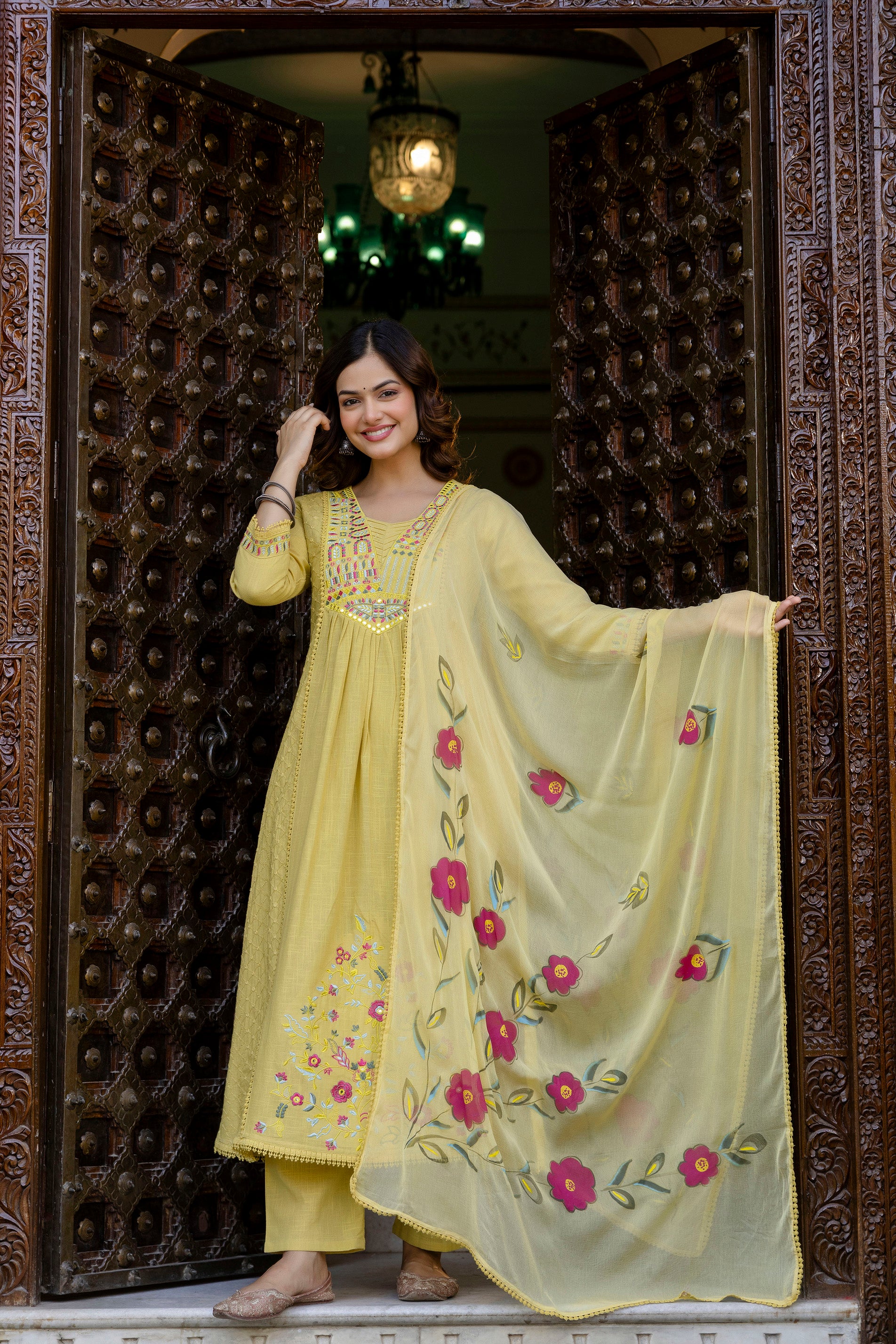 This EthniFlair Mustard Kurta Set is crafted with intricate detailing and a premium festive appeal. Made from rich cotton slub fabric, the kurta features elegant floral embroidery on the front panel along with beautifully crafted schiffli panels that add texture and sophistication. The unique brush paint effect on both the dupatta and the front panel enhances its artistic charm. Paired with comfortable cotton slub palazzos and a lightweight Nazneen dupatta, this ensemble is perfect for festive celebrations, special functions, and traditional gatherings.