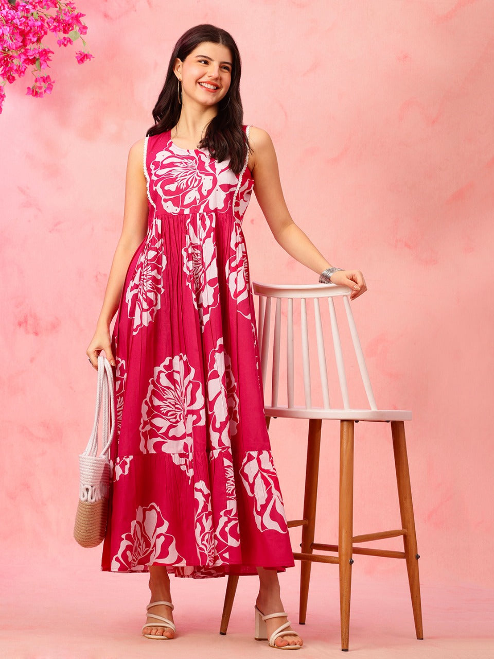 Embrace timeless elegance with the EthniFlair Floral Print Fit & Flare Maxi Dress. Designed in a soft pink hue, this cotton maxi dress features a flattering fit-and-flare silhouette that drapes beautifully for a graceful look. The delicate lace detailing and intricate handwork on the yoke add a touch of artisanal charm, making it perfect for brunch outings, vacations, festive gatherings, or everyday sophistication. Comfortable, stylish, and effortlessly feminine—this dress is a must-have addition to your wardrobe.