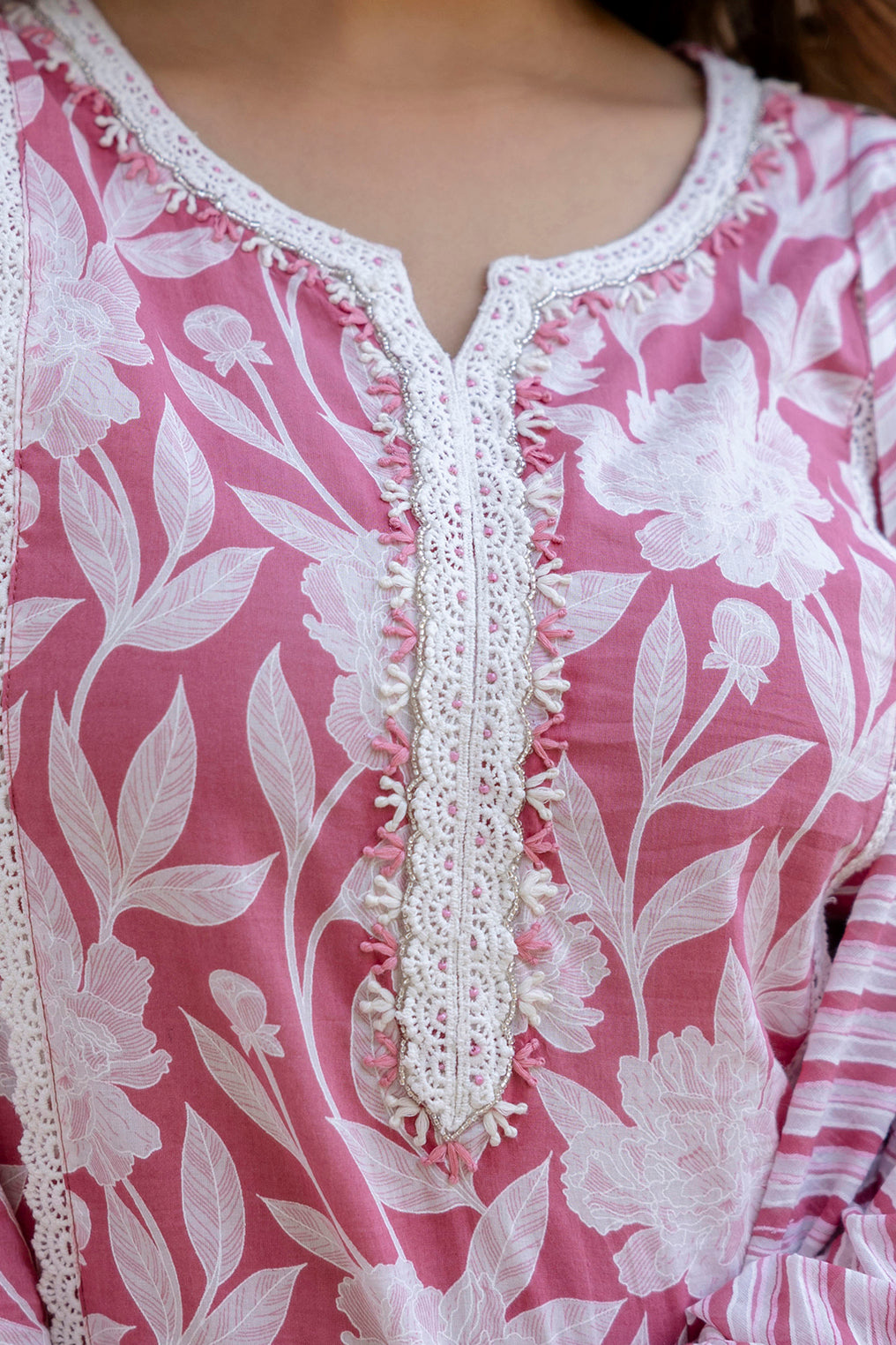 Experience graceful elegance with the EthniFlair Floral Printed Aari Work Kurta with Trousers & Dupatta. Made from soft and breathable cotton, this kurta set blends comfort with traditional artistry. The floral printed kurta is beautifully enhanced with delicate Aari hand work on the yoke, adding a refined handcrafted touch. Paired with comfortable cotton trousers and a lightweight mulmul dupatta, this ensemble is perfect for festive occasions, family functions, and elegant daytime outings.