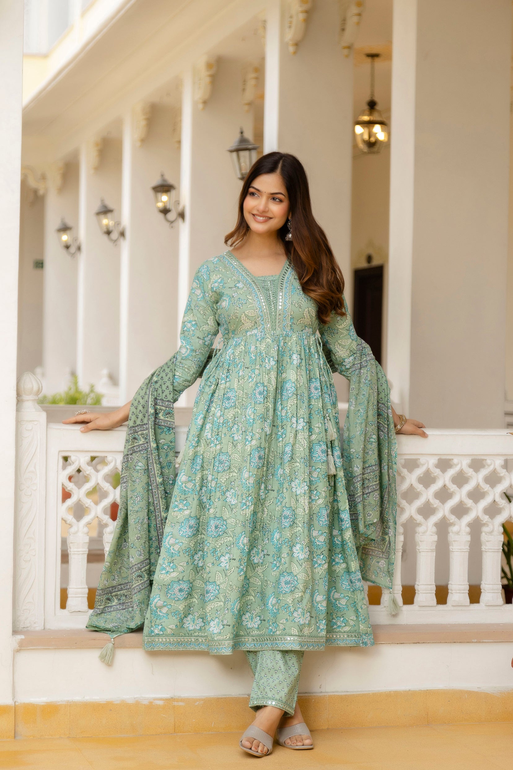 Enhance your festive wardrobe with this EthniFlair Floral Printed Empire Mirror Work Kurta with Trousers & Dupatta. Crafted from soft cotton, the green kurta features beautiful floral prints and intricate hand work on the yoke, adding a rich traditional touch. The empire silhouette is enhanced with neat pintucks, giving it an elegant fall and structured look. Paired with comfortable cotton trousers and a lightweight mulmul dupatta adorned with delicate tassels, this set offers both grace and comfort—perfect for festive occasions, cultural celebrations, and family gatherings.