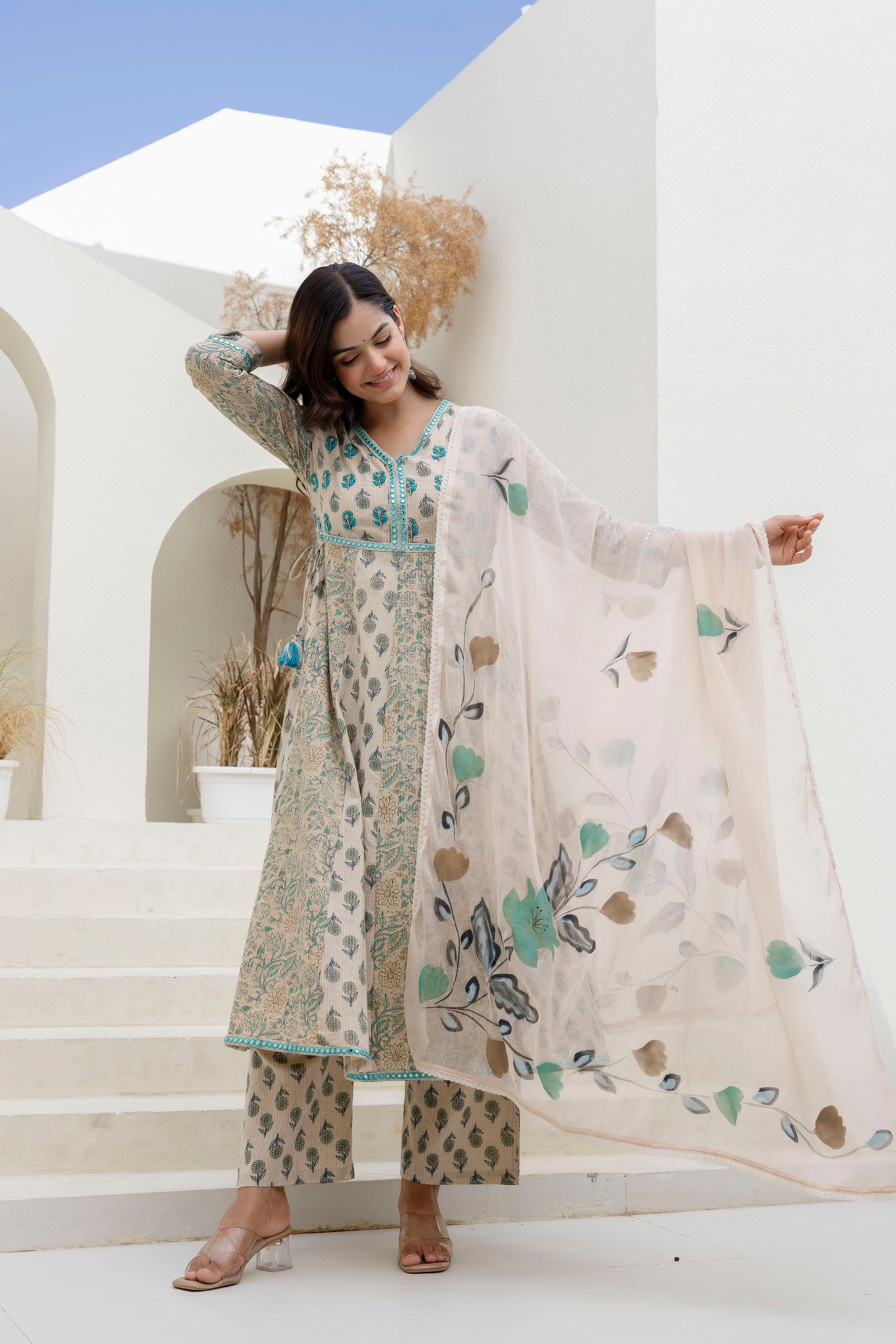 Style: Floral printed kurta with pyjama and dupatta