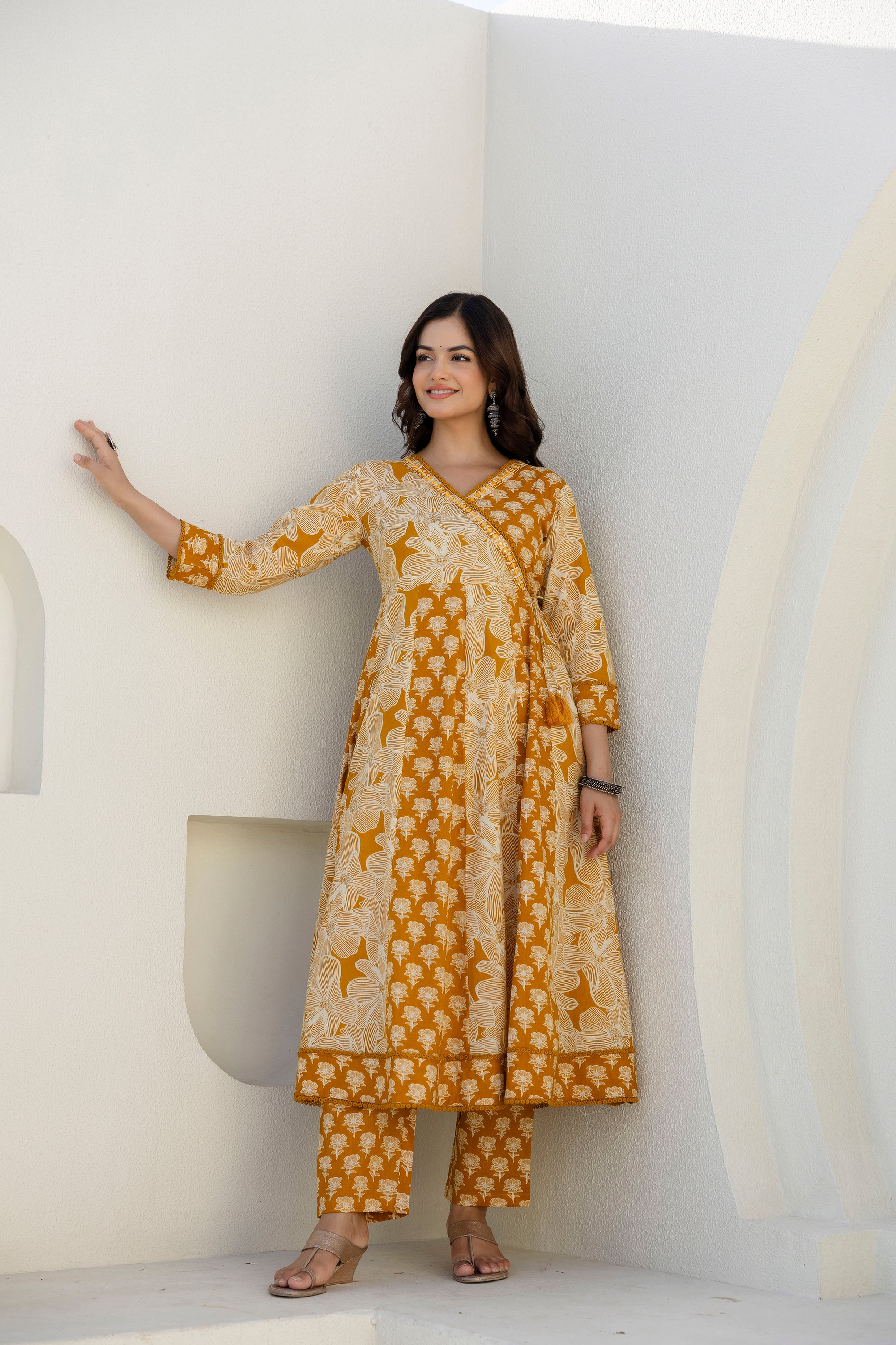 Style: Floral printed kurta with trousers and dupatta