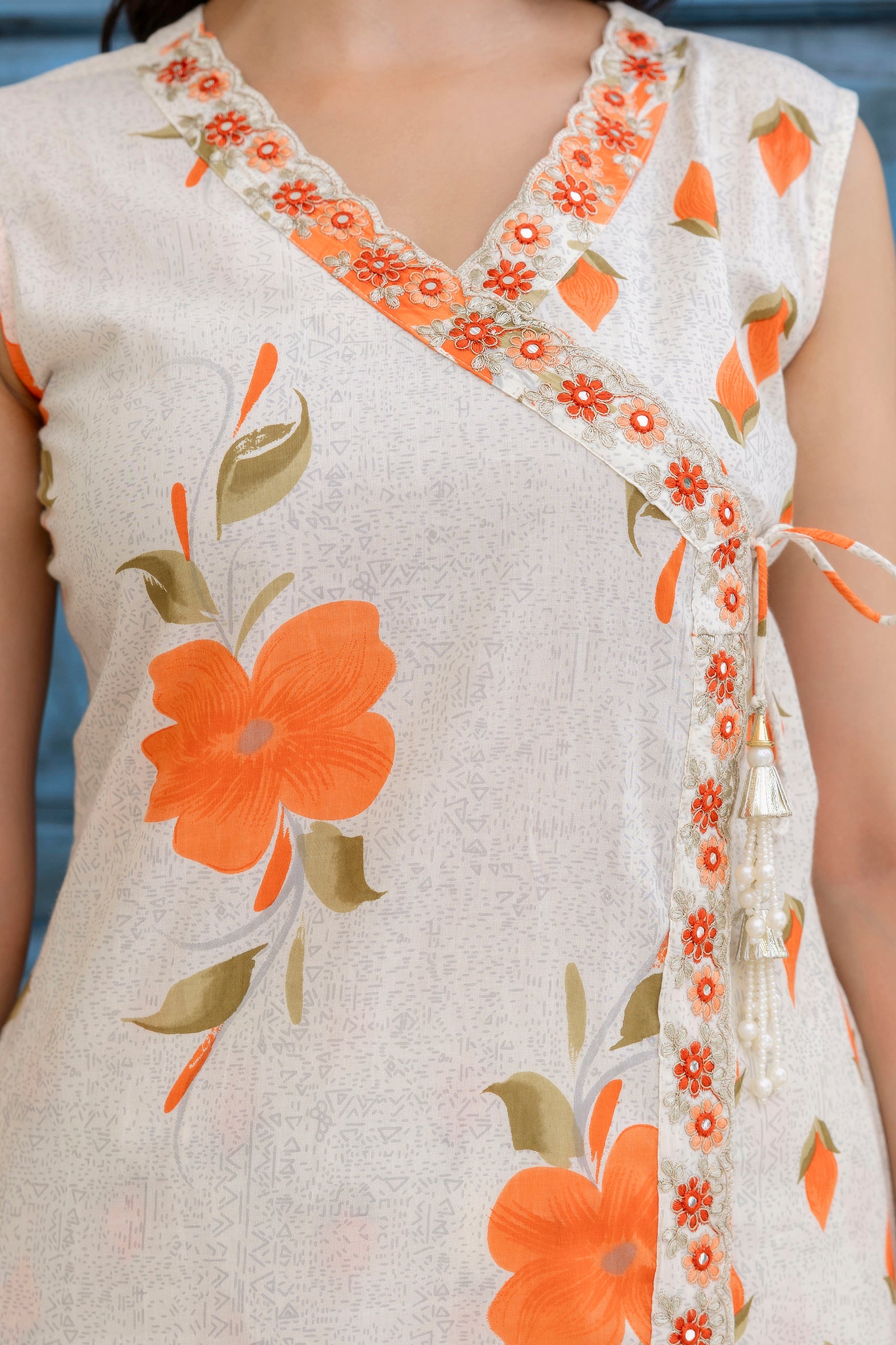 Step out in ethnic elegance with this EthniFlair Floral Printed Mirror Work Straight Kurta Set. Crafted from soft and breathable Cotton fabric, the kurta offers a comfortable and flattering fit. The yoke features intricate embroidery and mirror work, adding a sparkling and handcrafted appeal to the outfit.