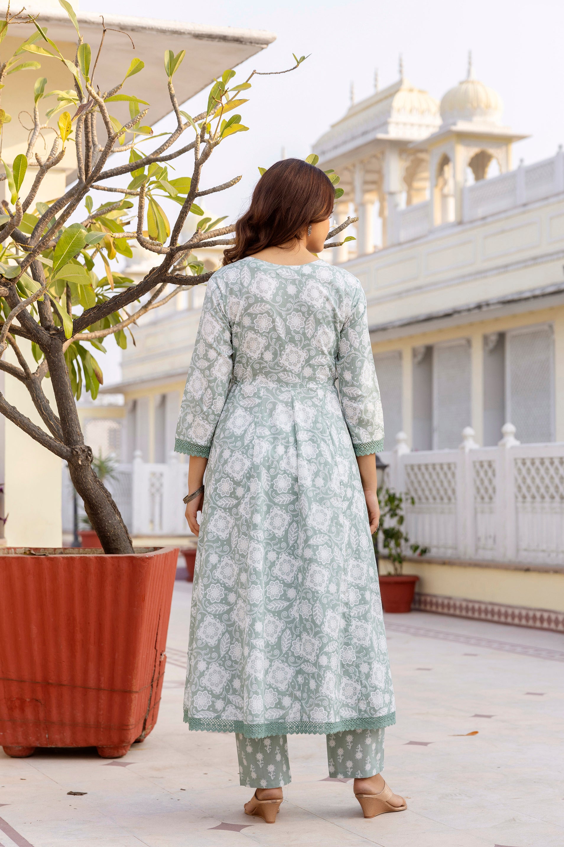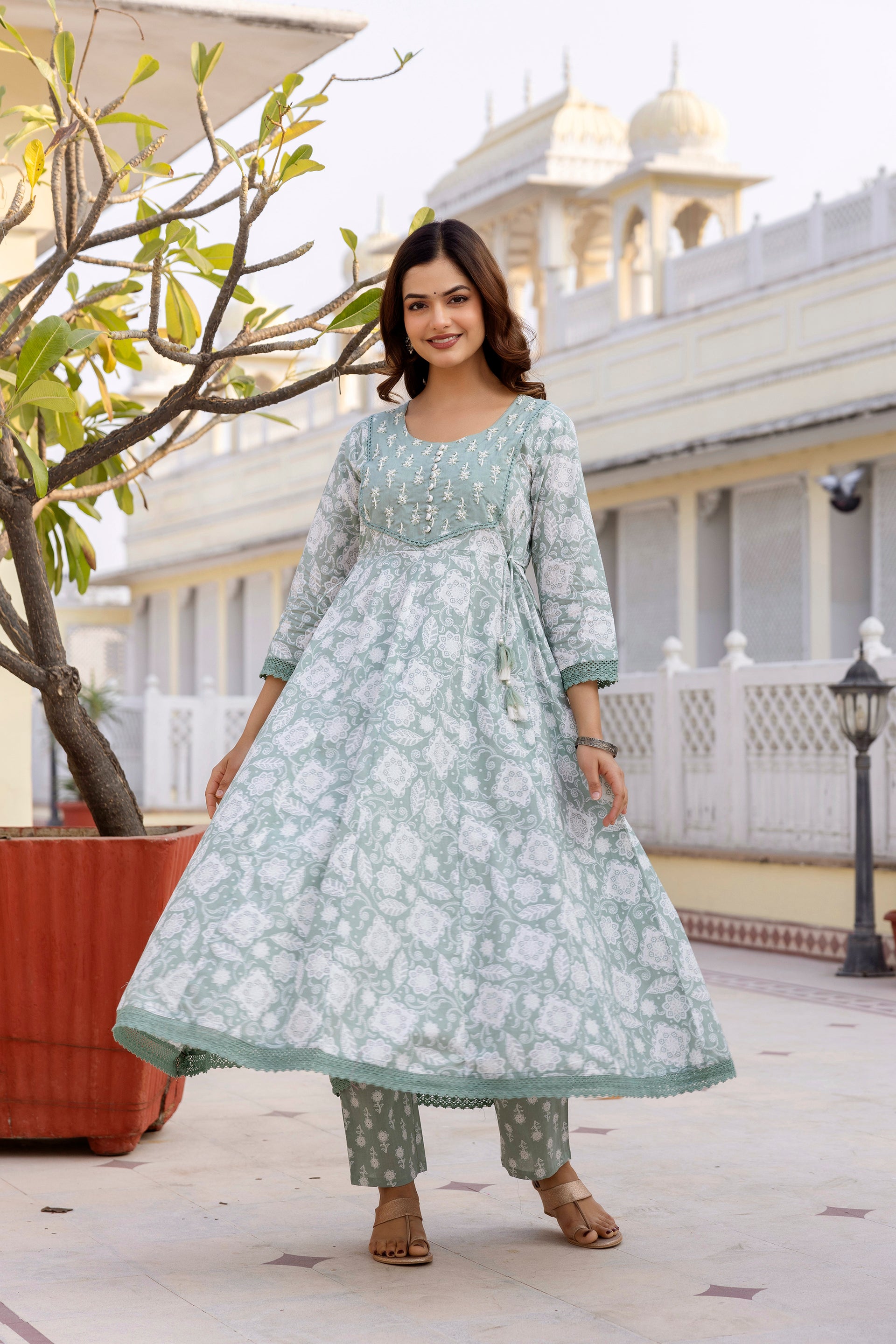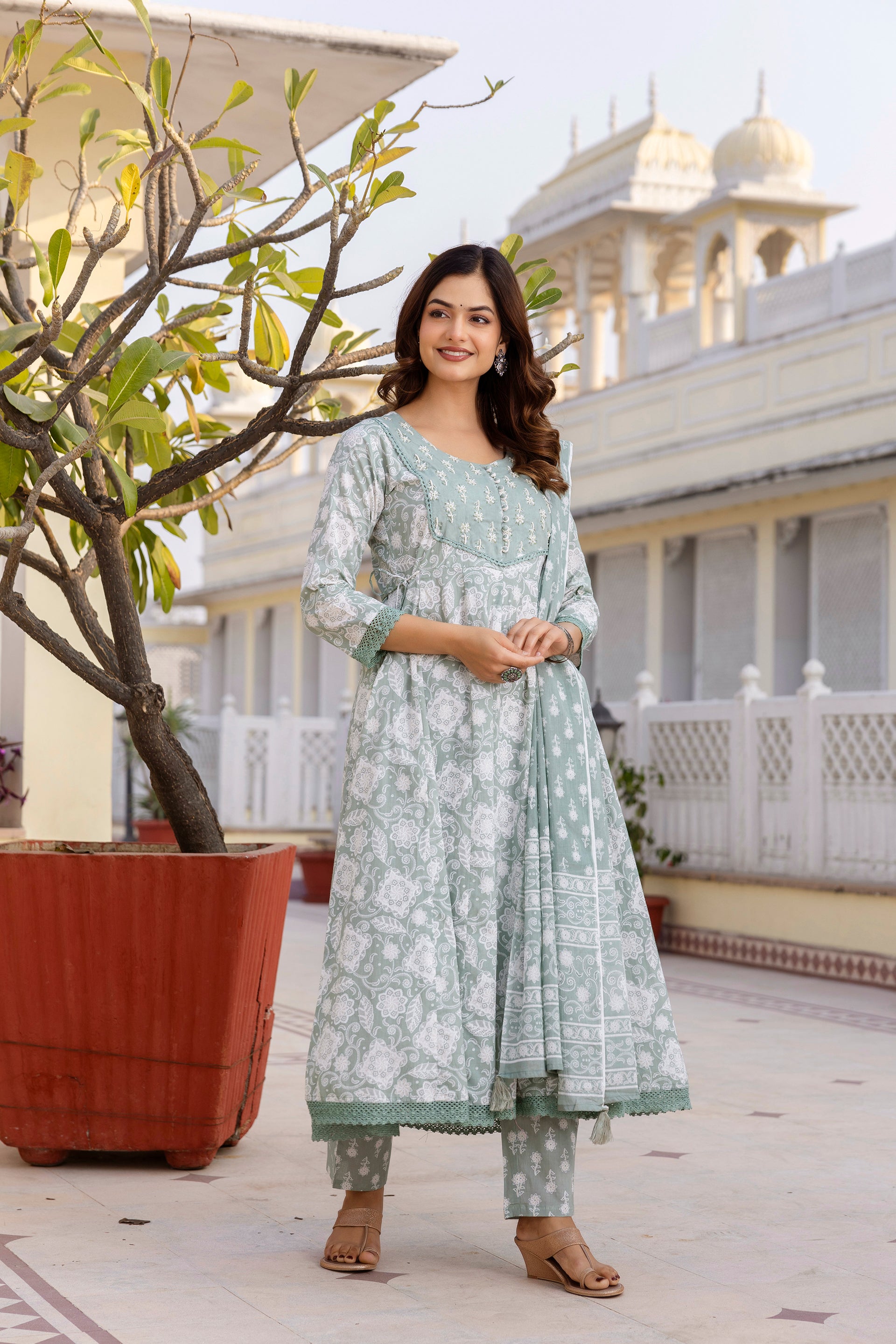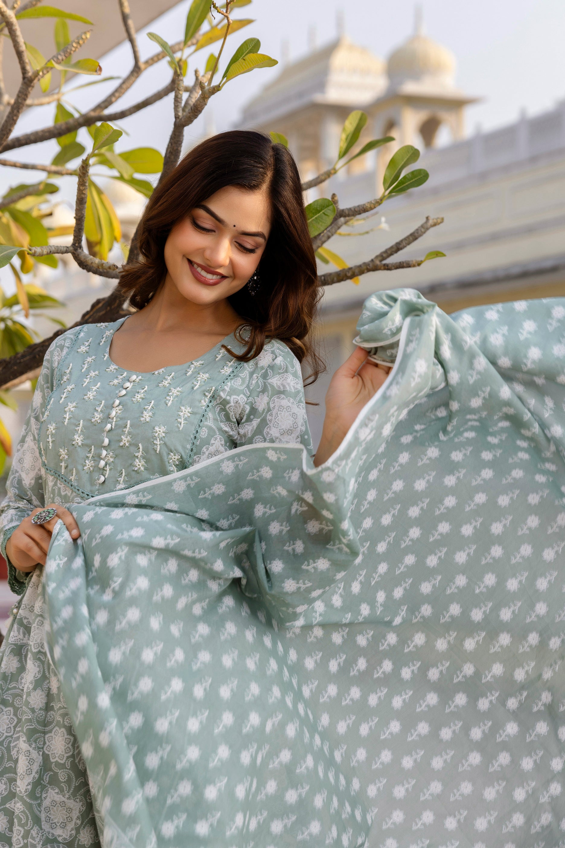 Elevate your ethnic wardrobe with this EthniFlair Floral Printed Round Neck Anarkali Kurta with Trousers & Dupatta. Made from soft, breathable cotton, the green Anarkali kurta features a flowy silhouette paired with beautiful floral prints. The hand work on the yoke adds a refined traditional touch, while cotton lace detailing enhances the overall festive look. The set includes comfortable cotton trousers and a lightweight mulmul dupatta that completes the elegant ensemble. Perfect for festive occasions, celebrations, and cultural gatherings.
