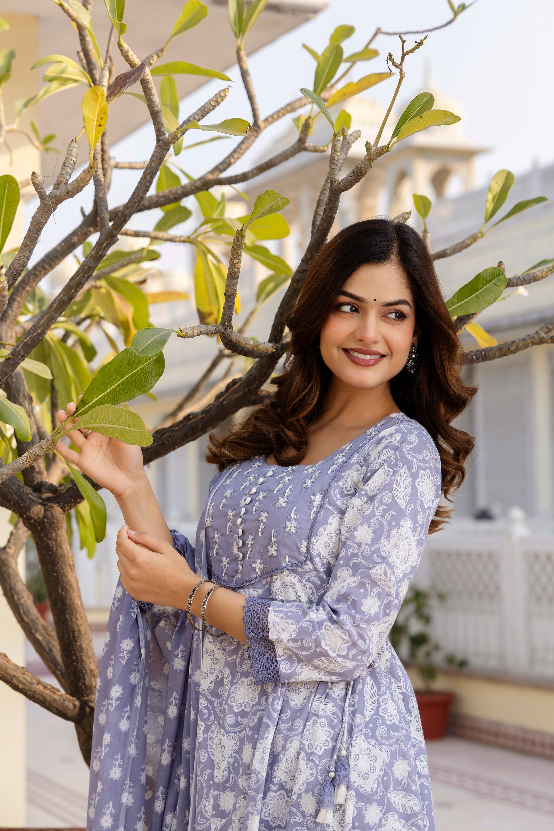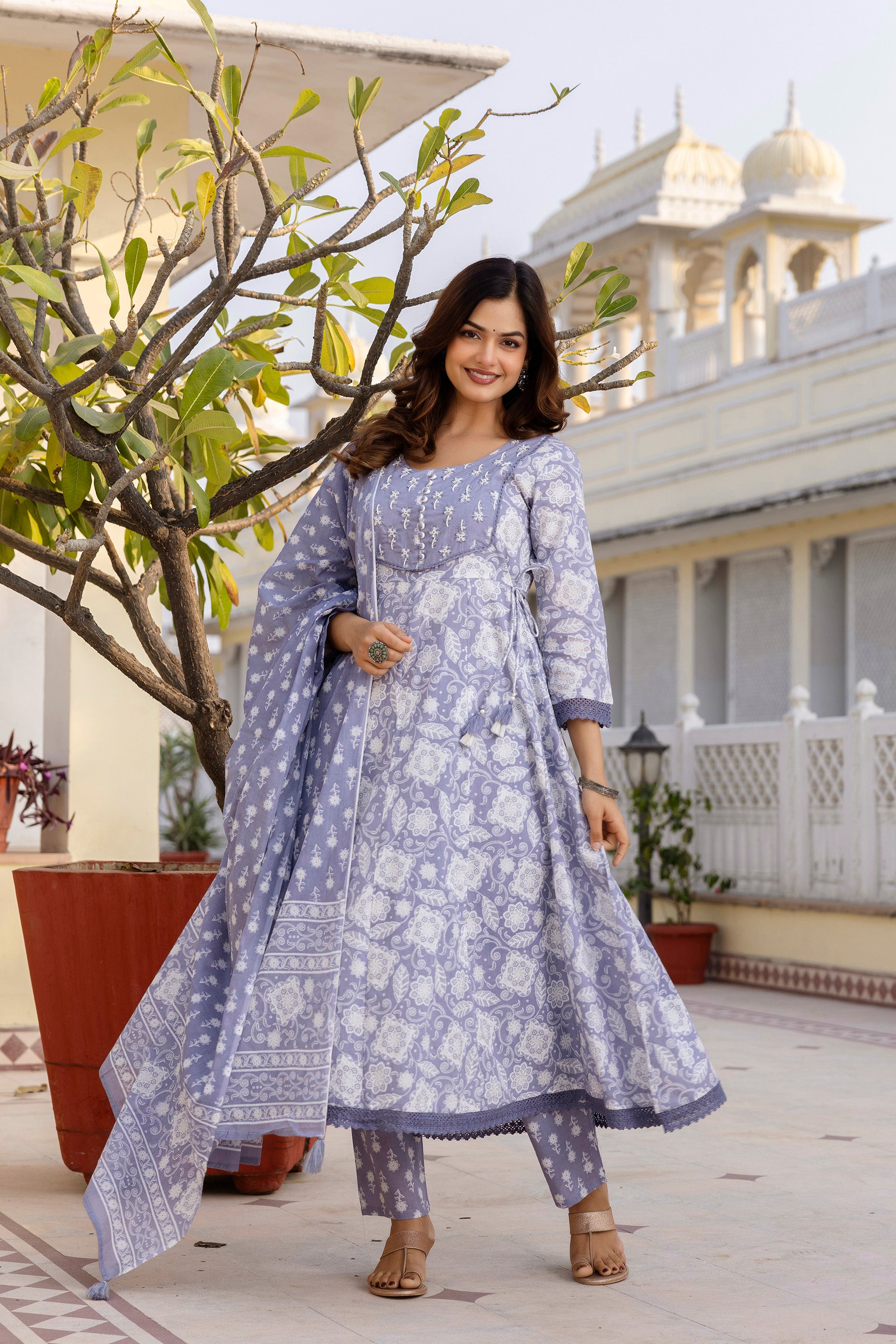 Enhance your ethnic wardrobe with this EthniFlair Floral Printed Round Neck Anarkali Kurta Set in a rich purple shade. The cotton kurta features a classic round neck and a flattering Anarkali silhouette, adorned with delicate handwork on the yoke for an elegant touch. Paired with comfortable cotton trousers and a soft Mulmul dupatta featuring cotton lace detailing, this set blends traditional charm with everyday comfort. Perfect for festive occasions, family gatherings, or casual ethnic wear, it offers a graceful and stylish look.