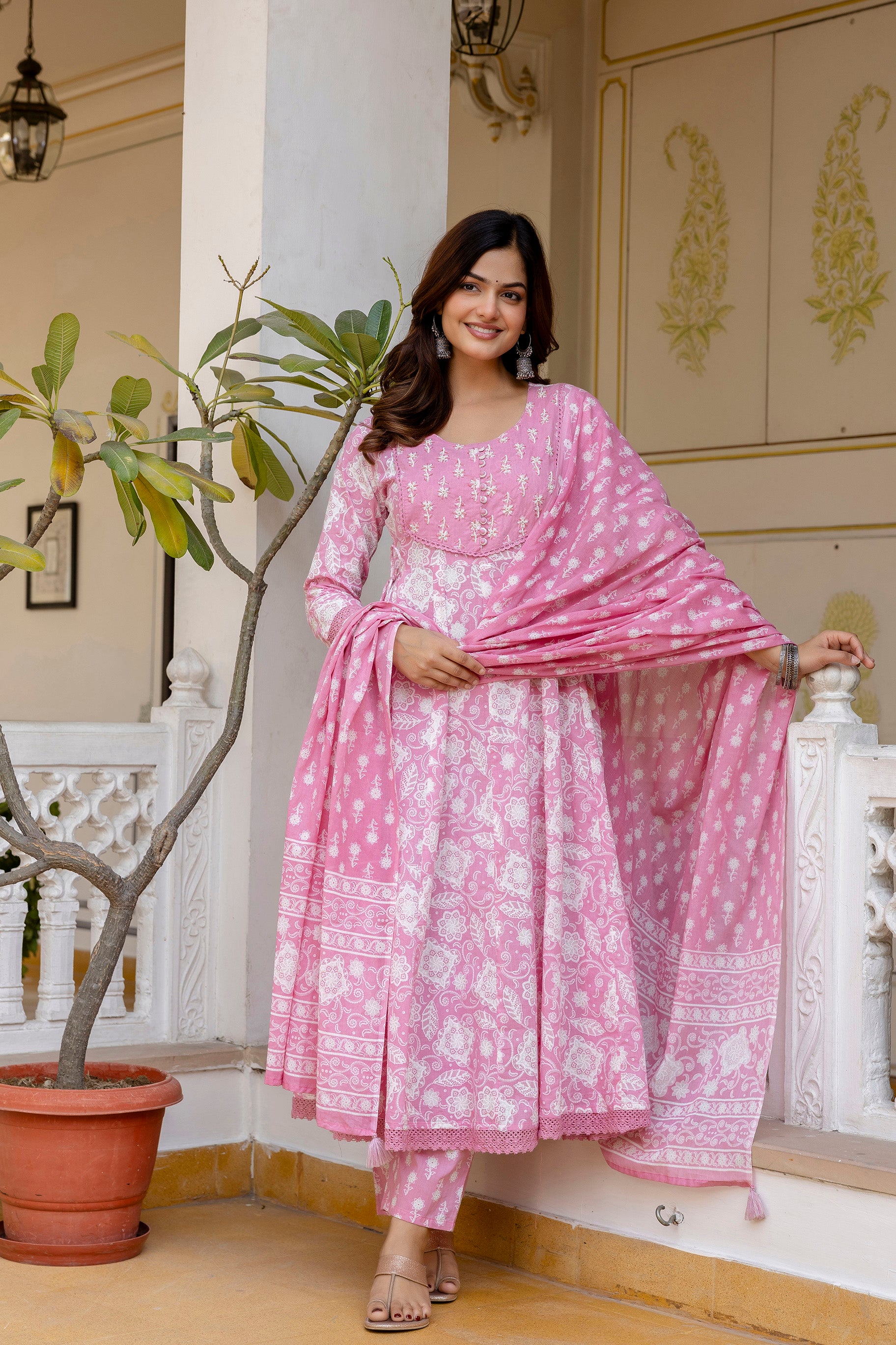 Brighten up your ethnic wardrobe with this EthniFlair Floral Printed Round Neck Anarkali Kurta Set in a charming pink shade. The cotton kurta features a round neck and a flowing Anarkali silhouette, highlighted with delicate handwork on the yoke. It comes with matching cotton trousers and a soft Mulmul dupatta with cotton lace detailing, creating a graceful and elegant ensemble. Perfect for festive occasions, family gatherings, or casual ethnic wear, this set blends comfort with timeless style.
