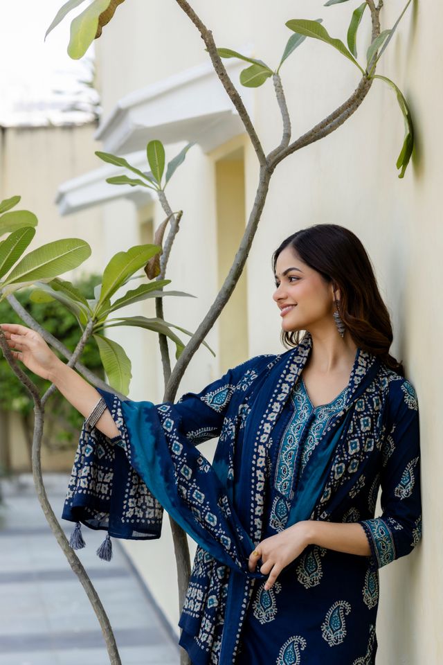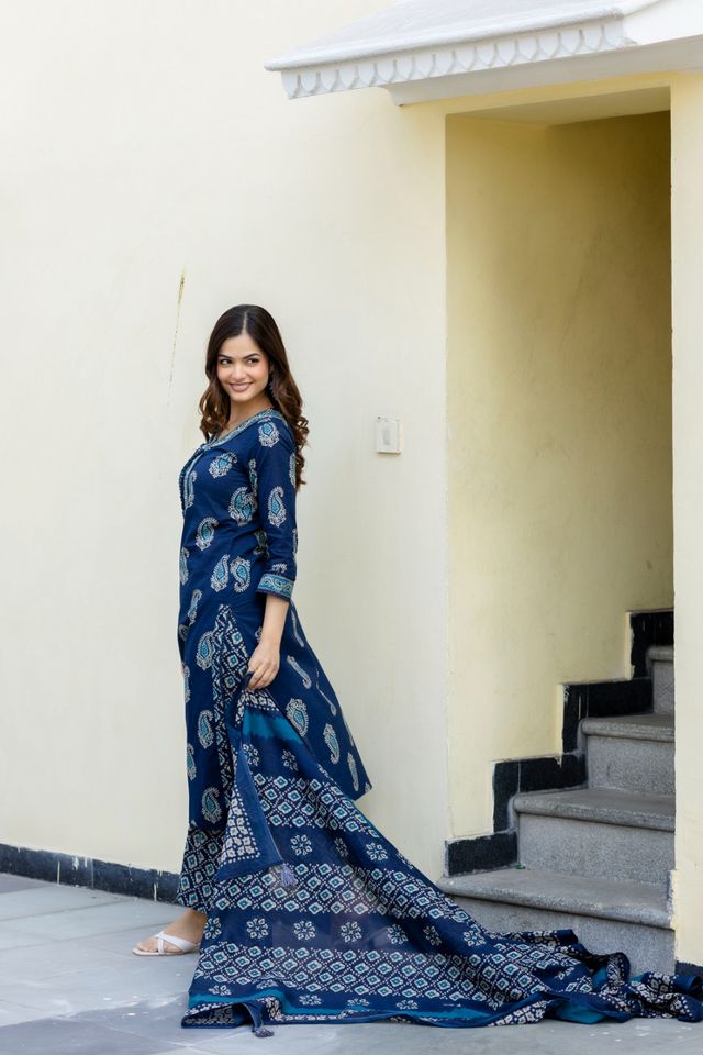 EthniFlair Women Cotton Yoke Detail Straight Kurta Pant Dupatta Set is crafted from breathable cotton fabric, offering comfort and style throughout the day. Featuring elegant yoke detailing and a straight-fit kurta, this ethnic set is paired with matching pants and a coordinated dupatta, making it ideal for daily wear, office wear, and casual festive occasions.